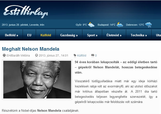 Nelson Mandelát, hosszas betegeskedése után." A cikkíró azon nyomban részvétet is nyilvánított a Nobel-díjas Mandela családjának. A cikk máig fent van az estihirlap.hu-n, biztos jól jön később.