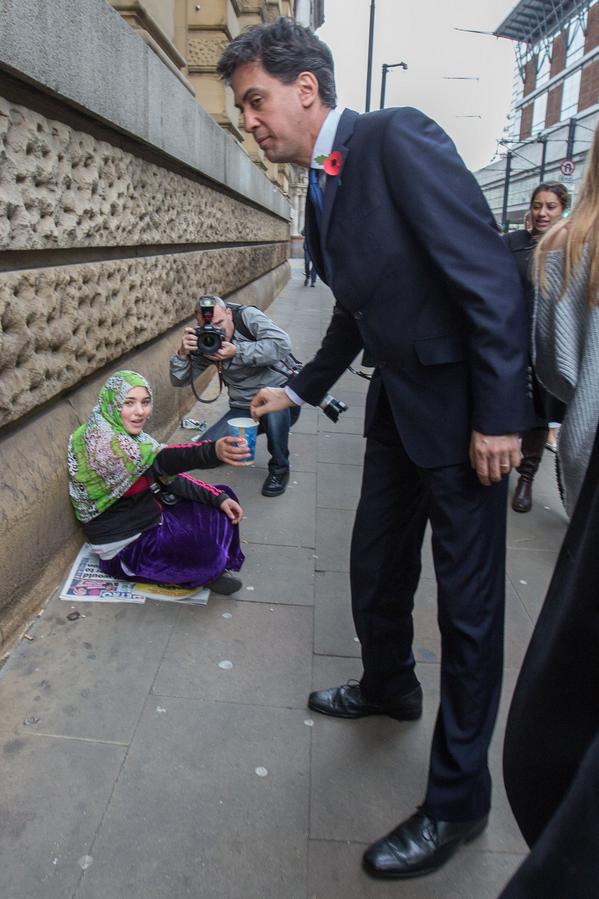 Lefényképezték a brit munkáspárt vezetőjét, Ed Millibandet, amint Manchester utcáin a kameráknak pózolva próbálja erősíteni népbarát imázsát. Ezúttal nem sikerült jól a dolog, mivel a koldusnak egy kétpenny-st adott, és közben elég fura fejet sikerült vágnia.