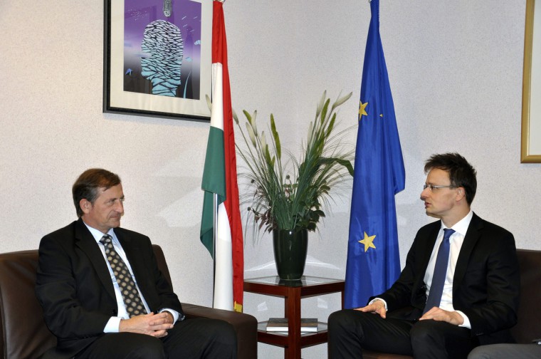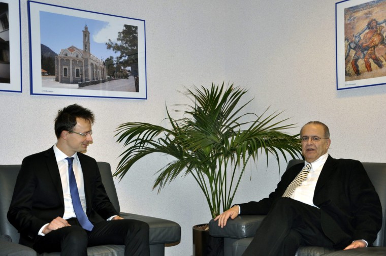 Szijjártó Péter külgazdasági és külügyminiszter (b) Joannisz Kaszulidesz ciprusi külügyminiszterrel (j) és egy szobanövénnyel (középen) a két ország közötti gazdasági és kereskedelmi együttmûködés élénkítésérõl tárgyal Brüsszelben 2015. január 19-én. MTI Fotó: Külgazdasági és Külügyminisztérium / Hajdú Márton