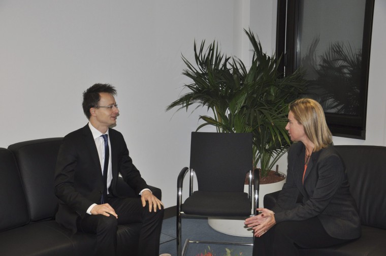 Szijjártó Péter (b) és Federica Mogherini (j), az Európai Unió kül- és biztonságpolitikai főmegbízottja és egy szobanövény (középen) megbeszélést folytat az Európai Unió Külügyek Tanácsa ülése elõtt az ukrajnai helyzetrõl és az Oroszországgal szemben bevezetett szankciókról Brüsszelben (Fotó: Külgazdasági és Külügyminisztérium / Hajdú Márton / MTI)
