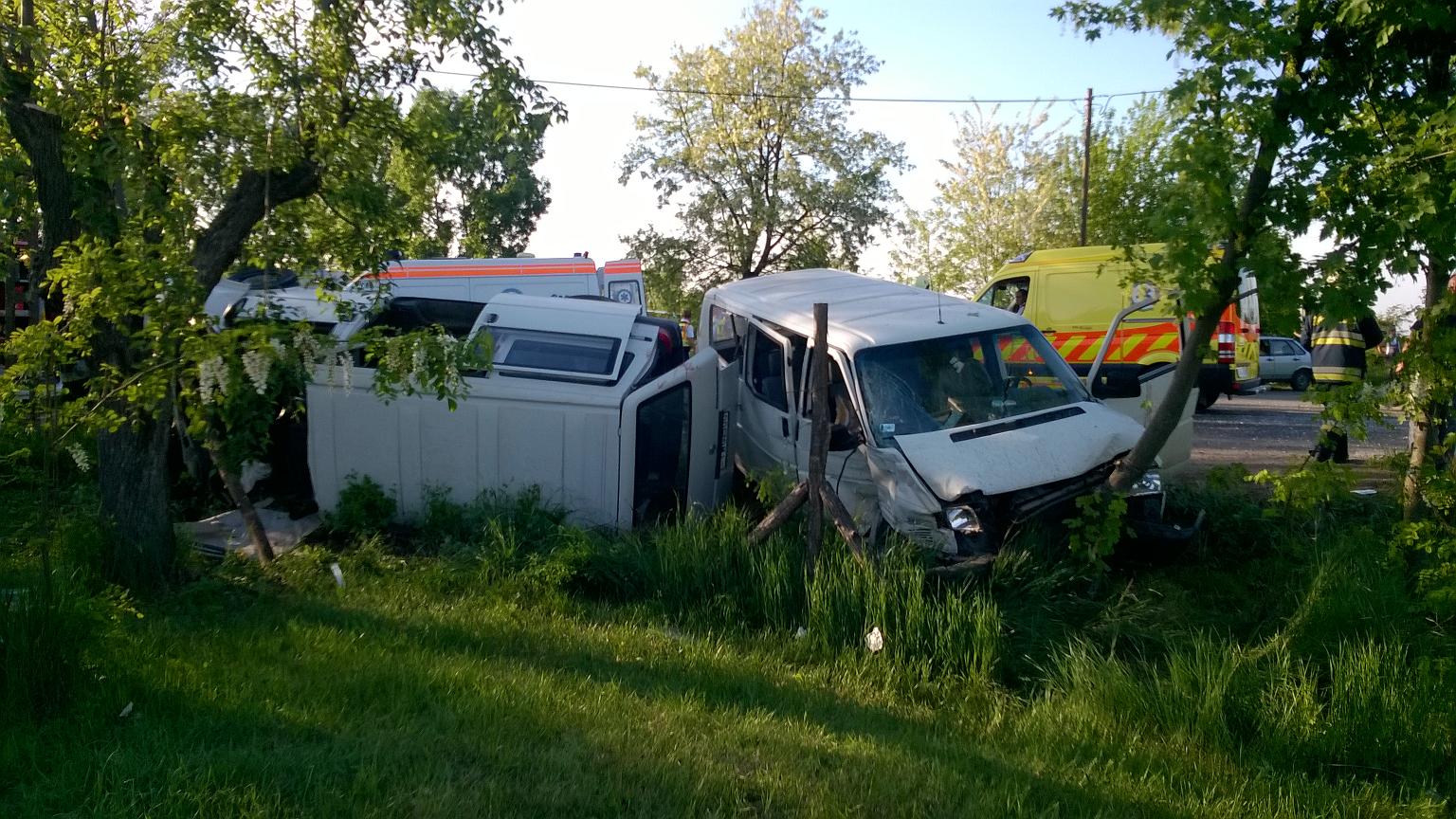 Május 12-én délután az egyik kisbusz nem adta meg az elsőbbséget az 5405-ös úton szabályosan közlekedő másiknak, emiatt a két kisbusz összeütközött. A furgonok fel is borultak, 12 embert kórházba kellett szállítani - egyiküket életveszélyes sérülésekkel, a képek alapján kisebb csoda, hogy senki sem vesztette életét.