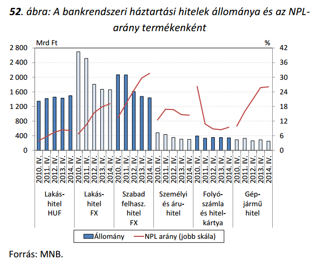 Az se túl jó, hogy a legtöbb lakossági hitelszerződés-típusba folyamatosan nő a nem teljesítő hitelek aránya a bankoknál (ezt a piros vonal és a jobb skála mutatja):