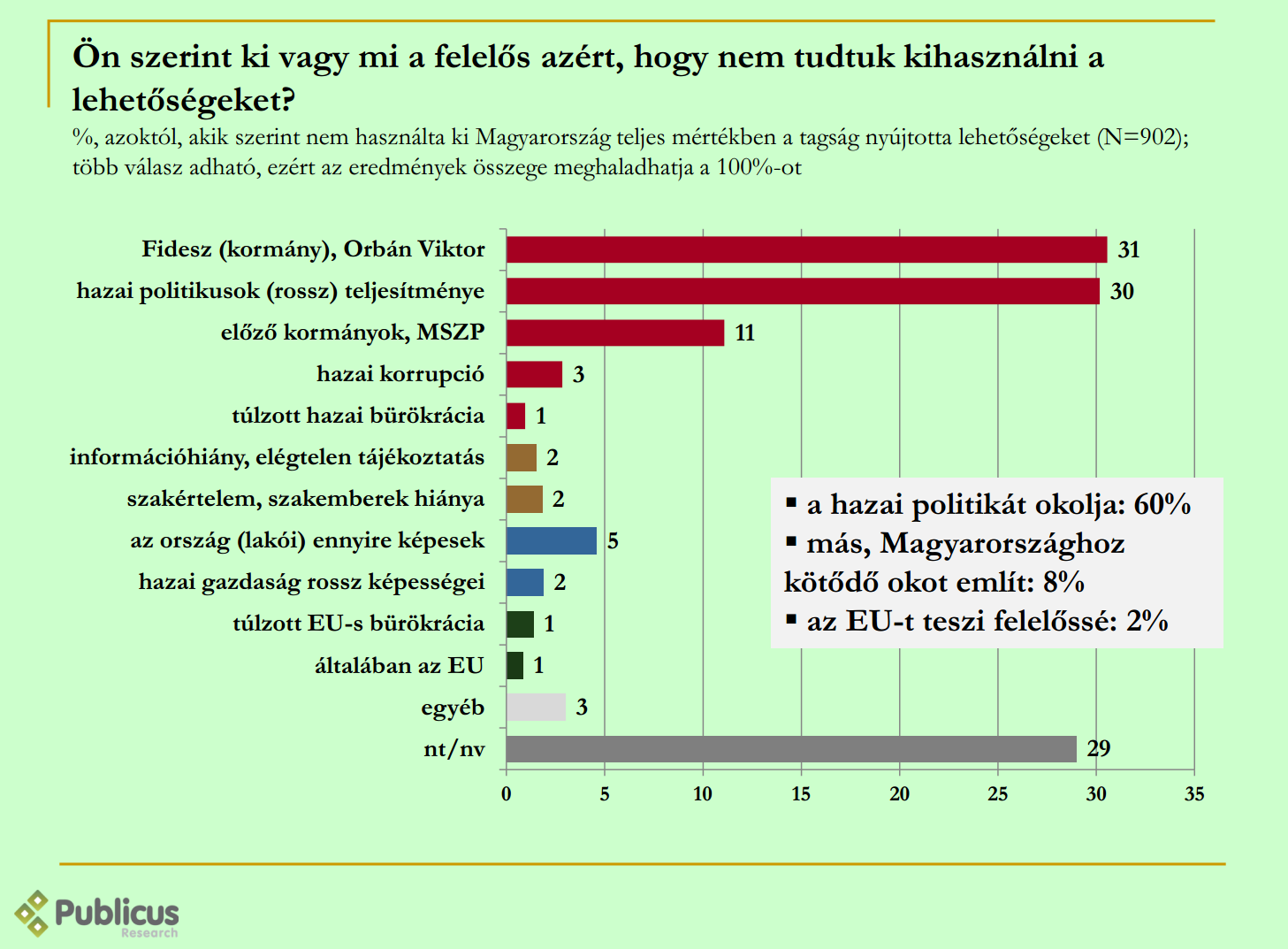 Ugyanakkor ha az a kérdés, hogy ki tudjuk-e használni az EU nyújtotta előnyöket, akkor minden társadalmi csoport inkább az igen felé húz. Akik szerint nem használtunk ki minden előnyt, azok elsősorban a hazai politikát okolják ezért, ezen belül elsősorban a Fideszt és Orbán Viktort. Erre a válaszra még a Fidesz-szavazók is hajlanak, 20 százalékuk tartja felelősnek saját pártját, amiért nem sikerült mindent kihozni az EU-tagságból.