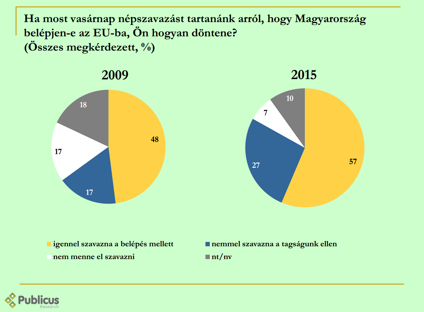 Ha most lenne egy népszavazás az EU-tagságról, a felmérés szerint a megkérdezettek 57 százaléka szavazna igennel, 27 százalék nemmel és van 17 százalék, aki bizonytalan vagy el se menne. A cég hat éve már készített hasonló kutatást, azóta mind az igenek, mind a nemek aránya tíz százalékponttal növekedett, azaz látszódik a társadalom polarizálódása.