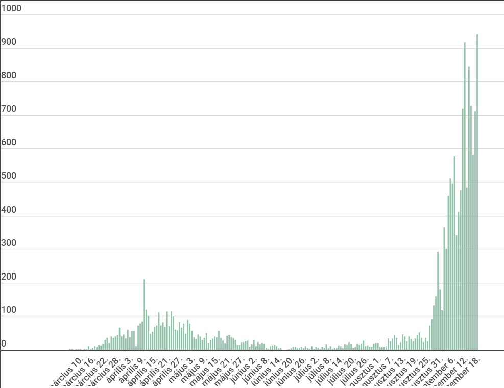 941 embernél mutatták ki a koronavírus-fertőzést pénteken, ez újabb napi rekord. Az utóbbi 24 órában hatan haltak meg. Az összesítések szerint tehát 16 111 főre nőtt a Magyarországon beazonosított fertőzöttek száma, közülük a járvány kezdete óta 669-en haltak meg. Igaz, szeptember 17-én éppen az elvégzett tesztek száma is rekordot döntött, a tesztelés azonban messze nem bővült olyan arányban, mint ahogy a napi új esetszám megugrott. A napi új fertőzöttek számának alakulása így néz ki a járvány eleje óta, tisztán látszik, hogy ennél gyorsabban még nem terjedt a vírus Magyarországon: