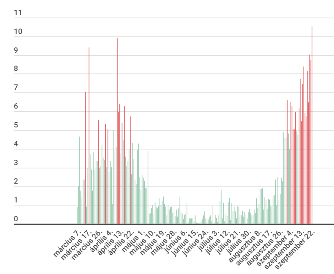 Az Egészségügyi Világszervezet szerint ennek az aránynak nem igen szabadna 5 százalék főlé mennie, ugyanis ez azt jelzi, hogy a fertőzöttek tényleges számához képest kevés tesztet végzünk. Ehhez képest Magyarországon már szeptember 11. óta minden nap 5 százalék feletti volt a magyar napi teszt/fertőzött arány. Az alábbi grafikonon piros oszlop jelzi az ilyen napokat: