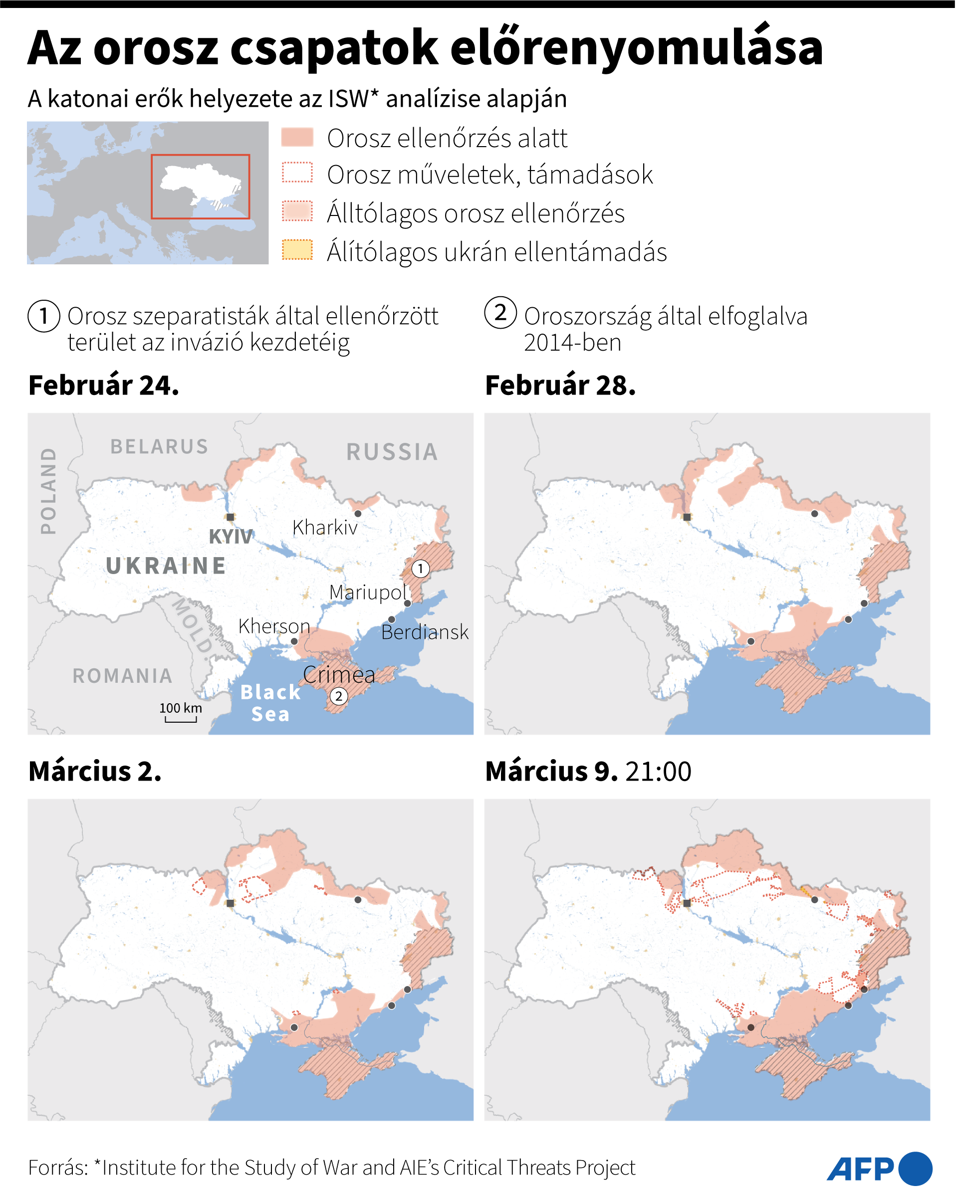 Két friss térkép az ukrajnai helyzetről A megnyitott humanitárius folyosók és a haderők állása: Mennyit haladtak az oroszok február 24. és március 9. között? 4 állapot az elmúlt 2 hétből: Grafika: AFP/444 Herczeg Márk 2022. március 10. 21:34 Megosztás Link másolása Facebook X (Twitter) Tumblr LinkedIn