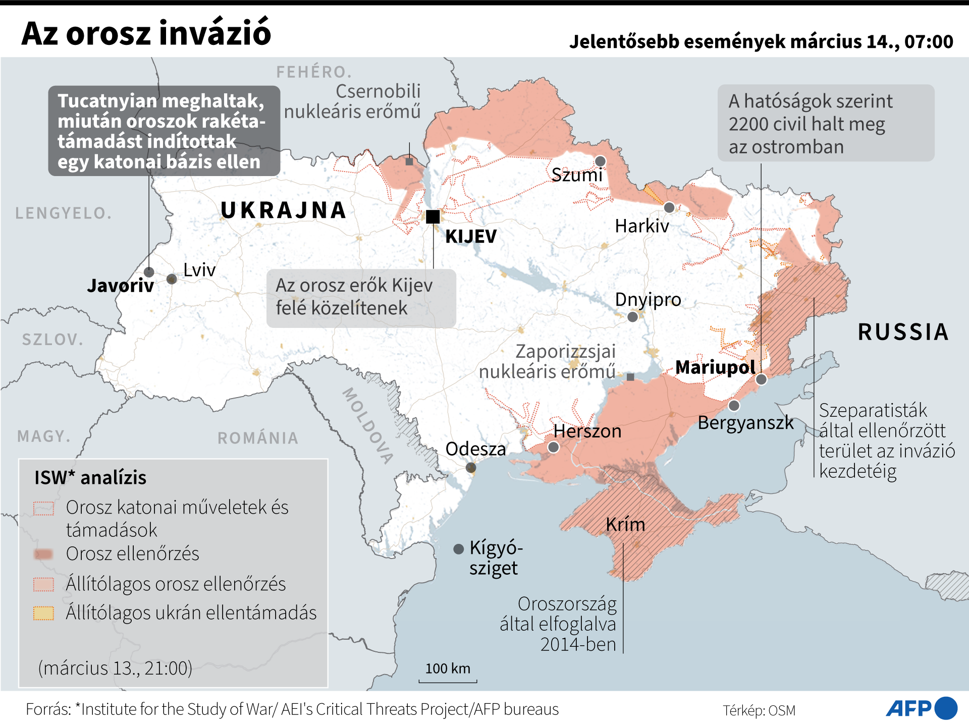 Térképen a háborús helyzet Grafika: AFP/444 Szurovecz Illés 2022. március 14. 10:11 Megosztás Link másolása Facebook X (Twitter) Tumblr LinkedIn
