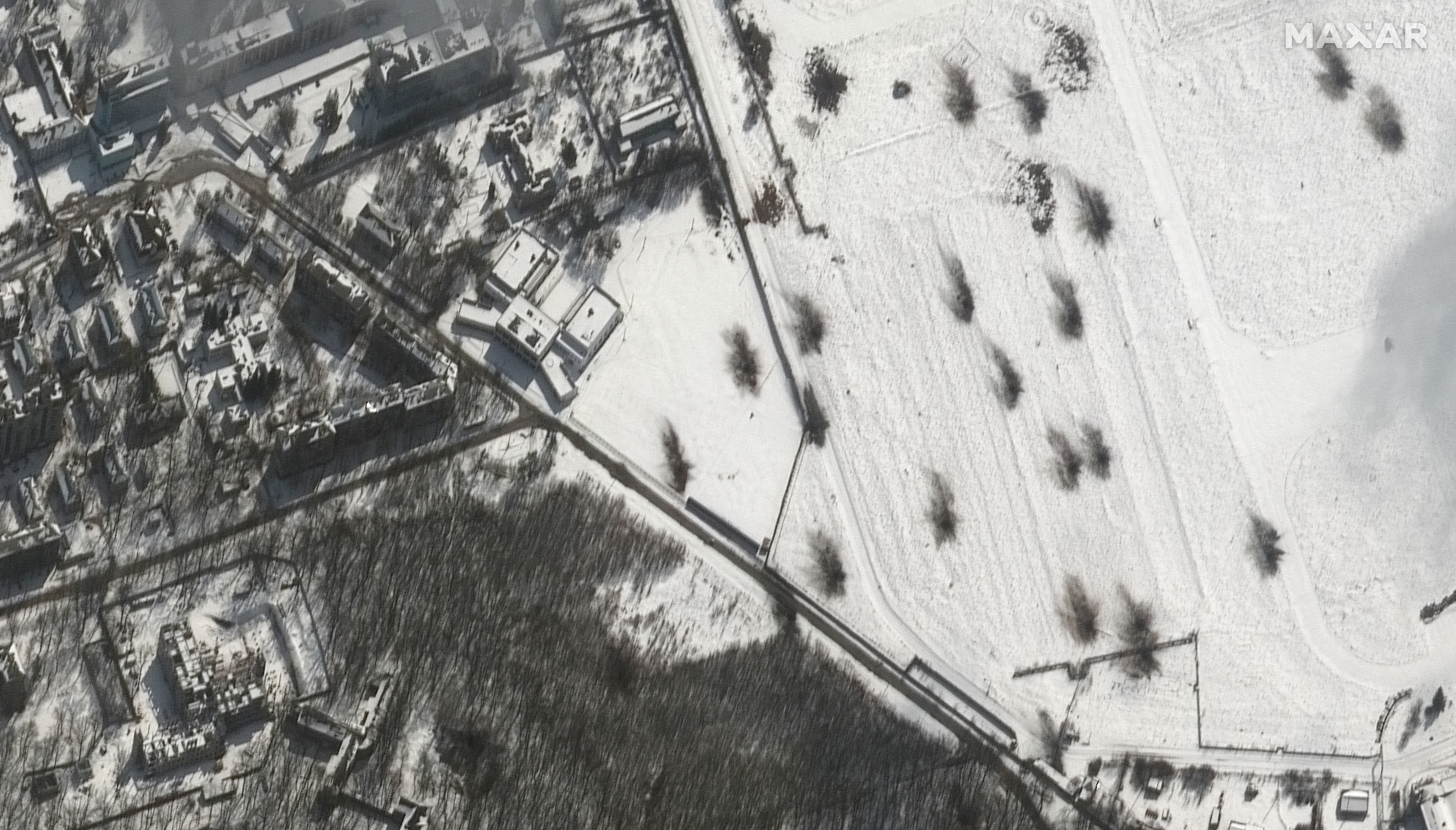 Tüzérségi lövedékek szaggatta kráterek egy harkivi lakóövezet határában a Maxar Technologies 2022. március 16-án nyilvánosságra hozott műholdképén.