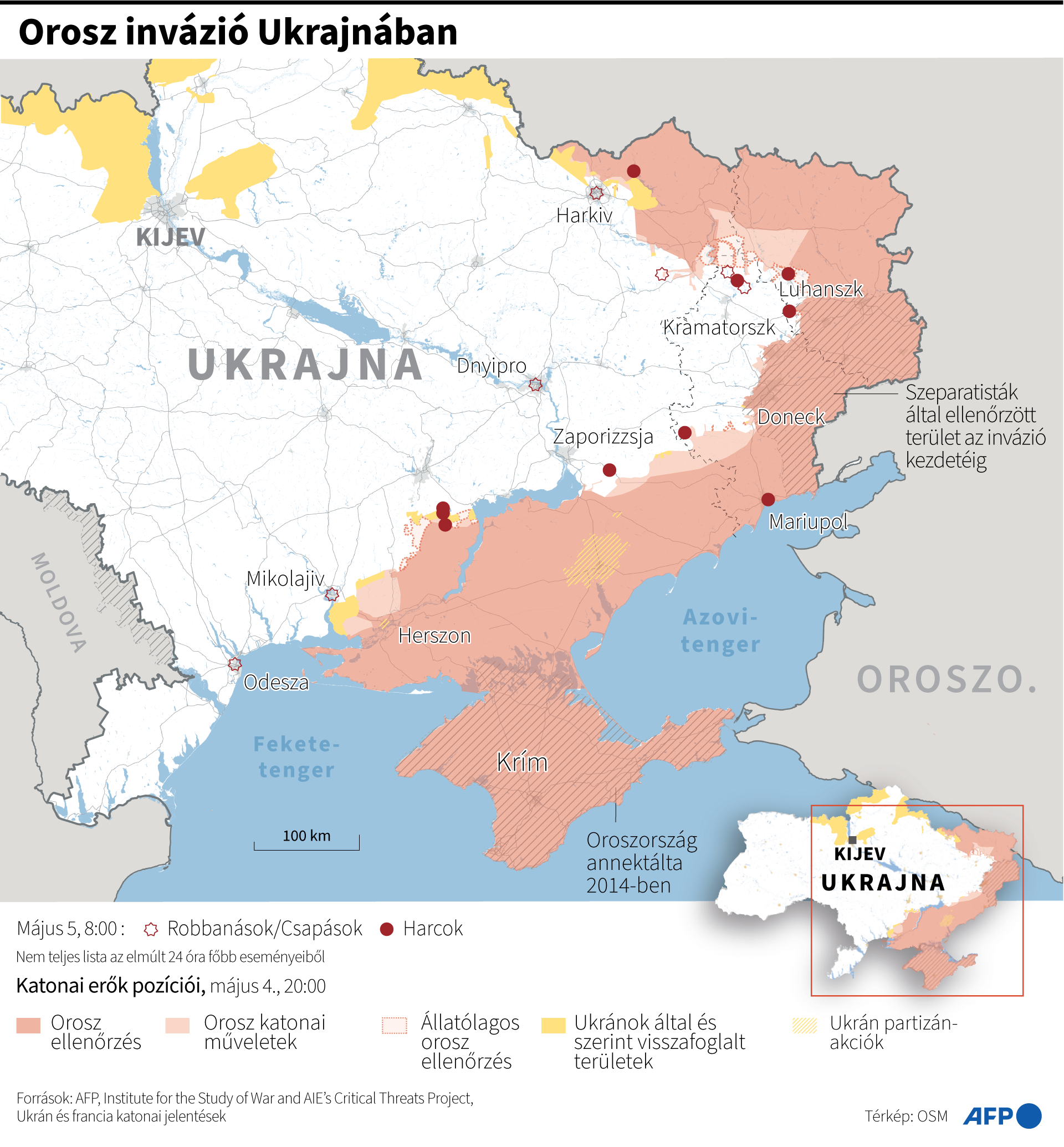 Az orosz hadsereg április közepén indította meg nagy keleti offenzíváját, de a már több mint két hete tartó harcokban nem sikerült érdemben területeket szereznie. A Pentagon elemzése szerint ennek az is oka lehet, hogy az ukrán táj ilyenkor sártenger, az orosz erők így nem tudnak elszakadni a főútvonalaktól. Ugyanakkor ezeken a főútvonalakon át újabb erősítéseket küldtek csütörtökön az izjumi zsebbe. Ez a Harkivtól keletre lévő kiszögelés száz kilométer mélyen nyúlik be az ukrán területekre, a város körül március eleje óta zajlik a háború egyik legfontosabb csatája. Innen kitörve az orosz erők kapcsolatot találhatnának a luhanszki front déli részén, Popasznánál áttörni készülő orosz erőkkel, átkarolva a luhanszki frontszakasz ukrán védőit. Ám Popasznánál csütörtökön se értek el sikereket.