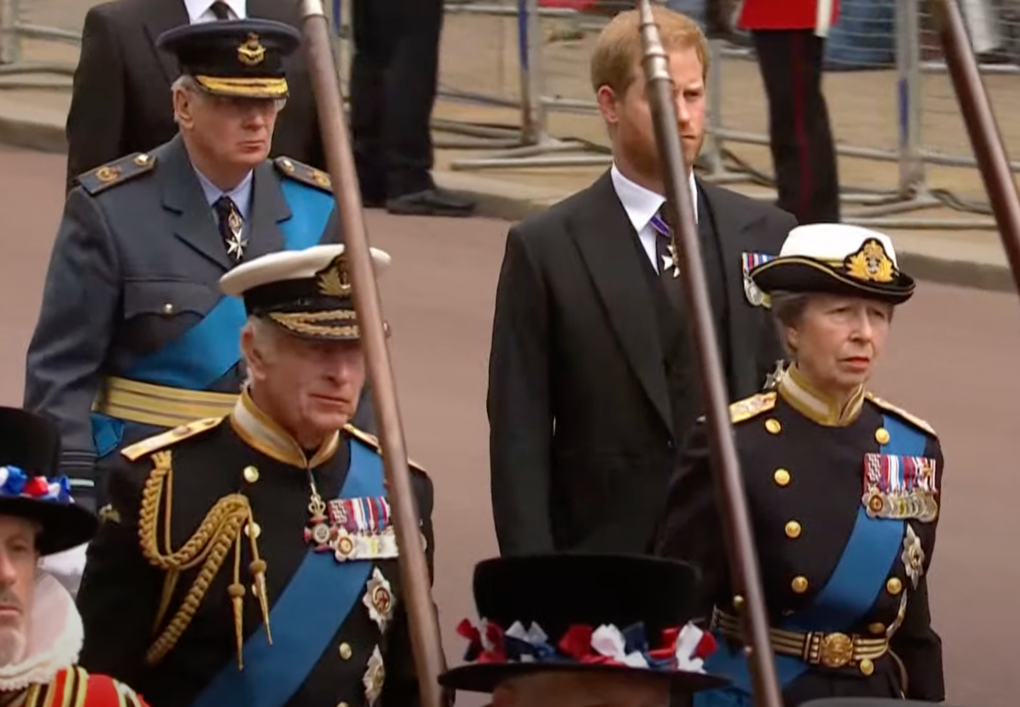 Korábban írtuk, hogy a királyi család női tagjai autóba szállva követik a menetet, míg a férfiak lábon. Azonban II. Erzsébet egyetlen lánya, Anna hercegnő is ott menetel Károly király mellett.