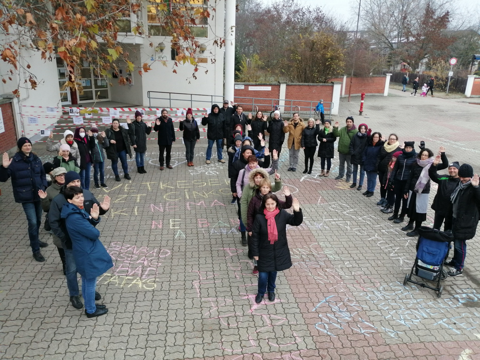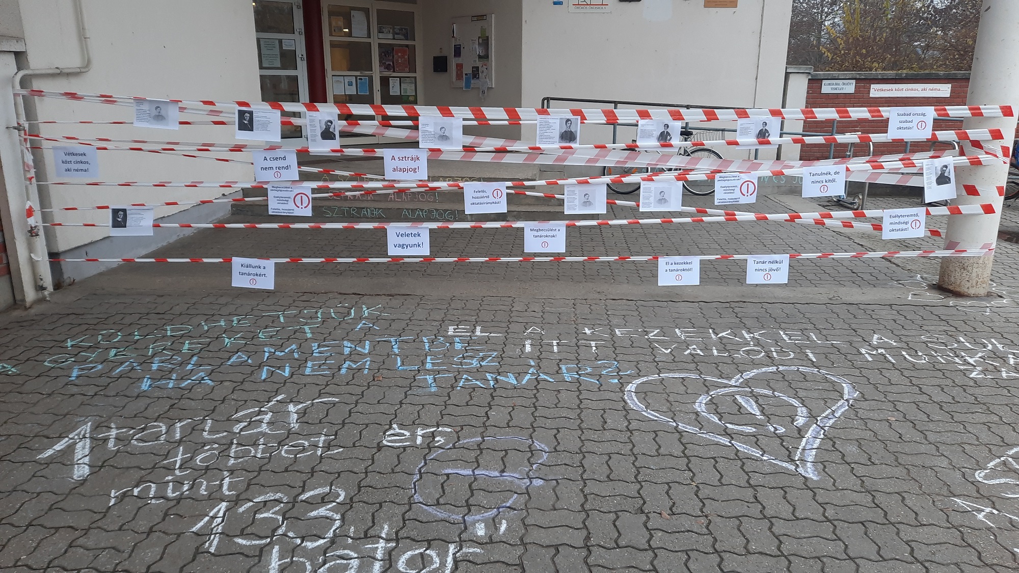 Olvasónk küldte, hogy az újpesti Homoktövis Általános Iskolát a szülők körbekordonozták, a kordonra és a kerítésre pedig különböző üzeneteket helyeztek el. Az iskolában körülbelül 30-an sztrájkolnak, a tanulók 90 százaléka pedig otthon maradt.