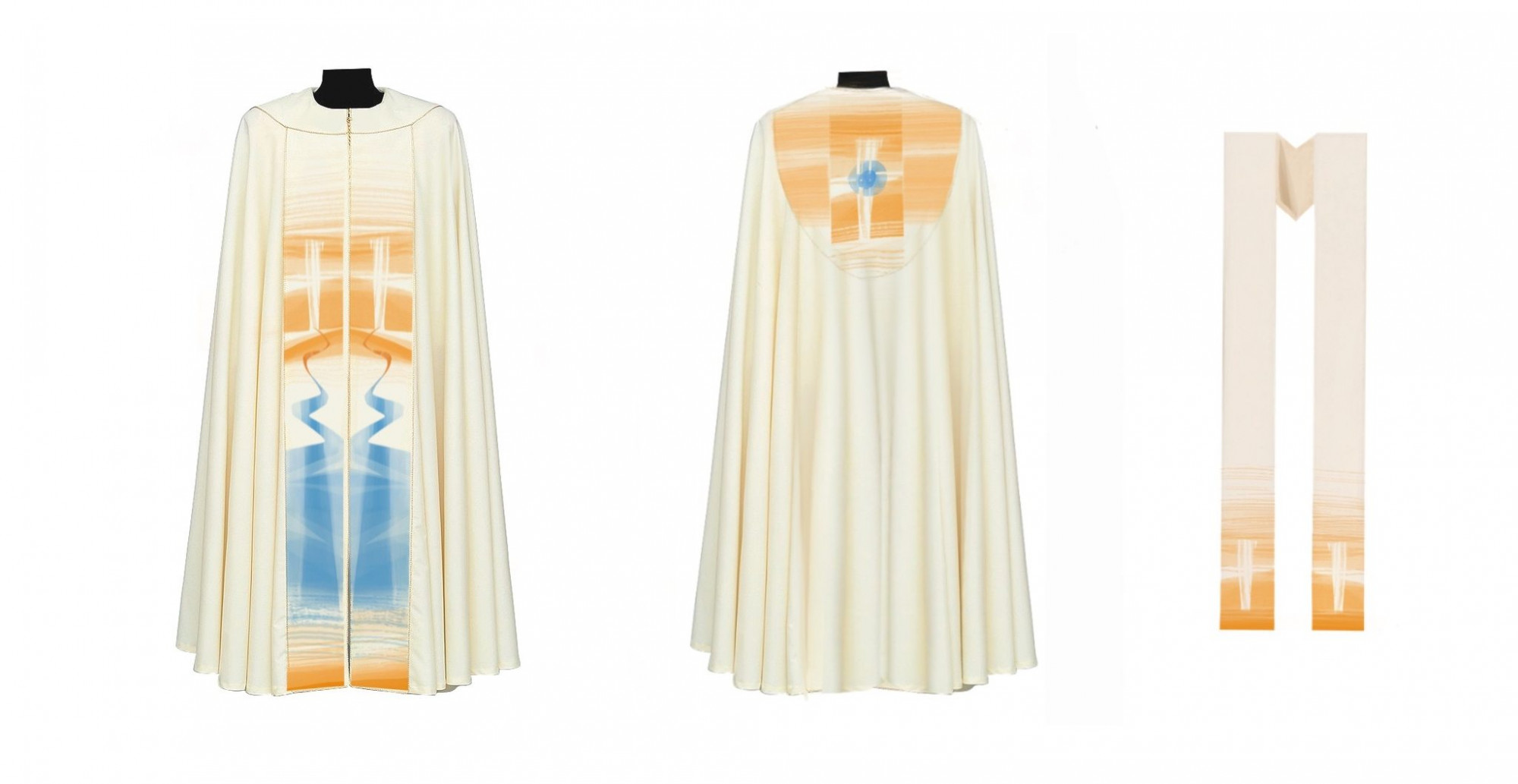 A miseruhán a fehér és az arany színek dominálnak, amelyek katolikus hagyományok és liturgikus előírások szerint a húsvéti időszakra utalnak. Az öltözéknek része a miseruha, a stóla, a püspöki süveg, a palást és a diakónusok számára készített dalmatika is.