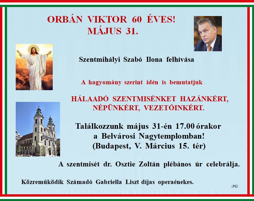 A Belvárosi Nagytemplomban, tehát még egyszer: 17 órától tartja dr. Osztie Zoltán plébános úr az éves hálaadó szentmisét hazánkért, népünkért, vezetőinkért, Orbán Viktorért!. Legyünk ott mind!