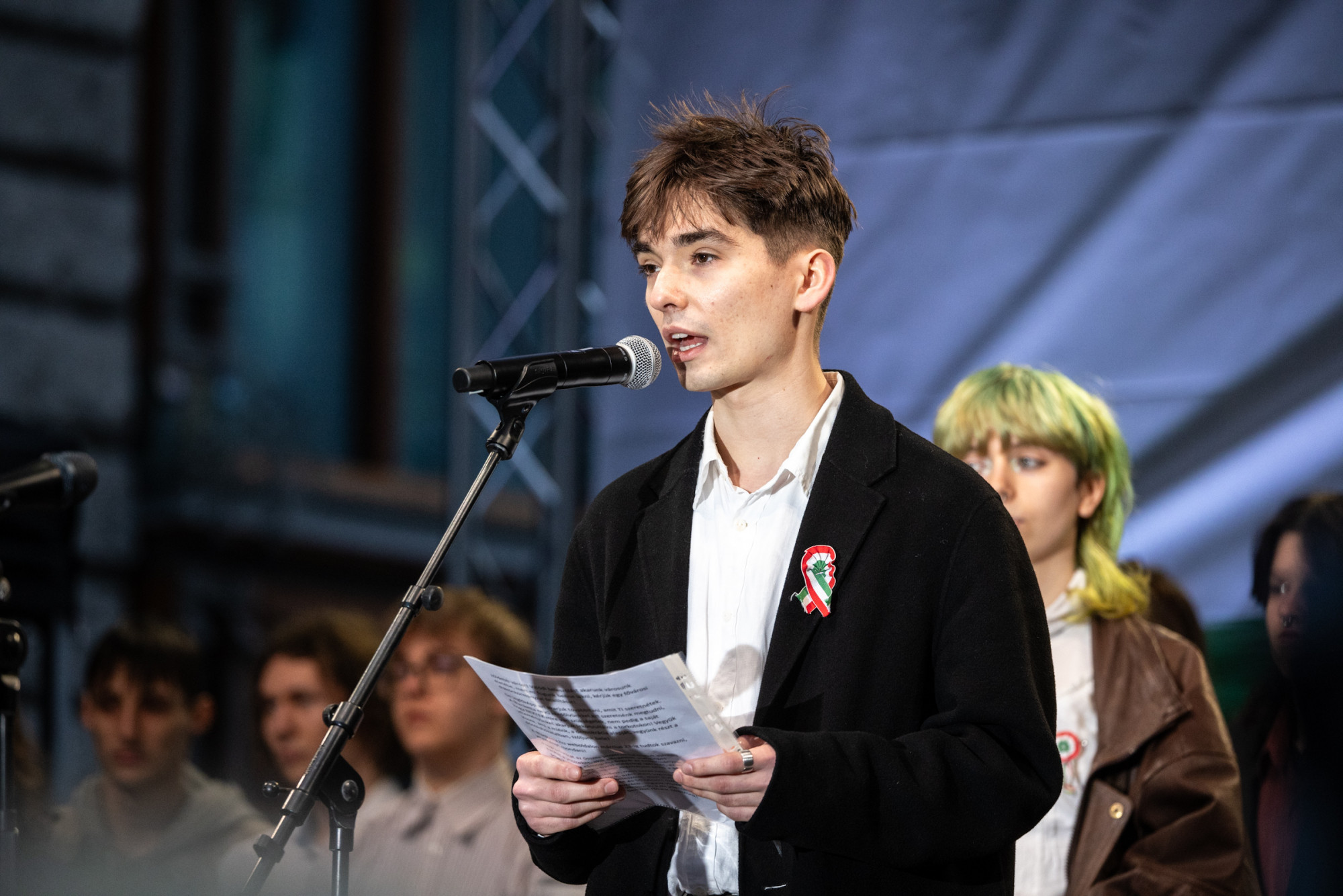 „20 éve élek itt. Amióta az eszemet tudom, azt érzem, hogy ez az egész egyáltalán nem rólam szól. A nevemben döntenek. Azt mondják értem tesznek így, érted csinálják úgy. Azt harsogják, hogy egyek vagyunk, véleményünket, hitünket magukénak tulajdonítják, mégis, valójában semmi közöm az egészhez. Miért vagyunk hát itt? Most épp nem vernek minket a várban, ez nem lesz címlakép. Miért vagyunk hát itt? Most épp nem rúgták ki a kedvenc tanárunkat, én elhiszem, hogy ez kevesebb kattintást hoz” – mondta Perlaki-Borsos Noel az Egységes Diákfronttól.