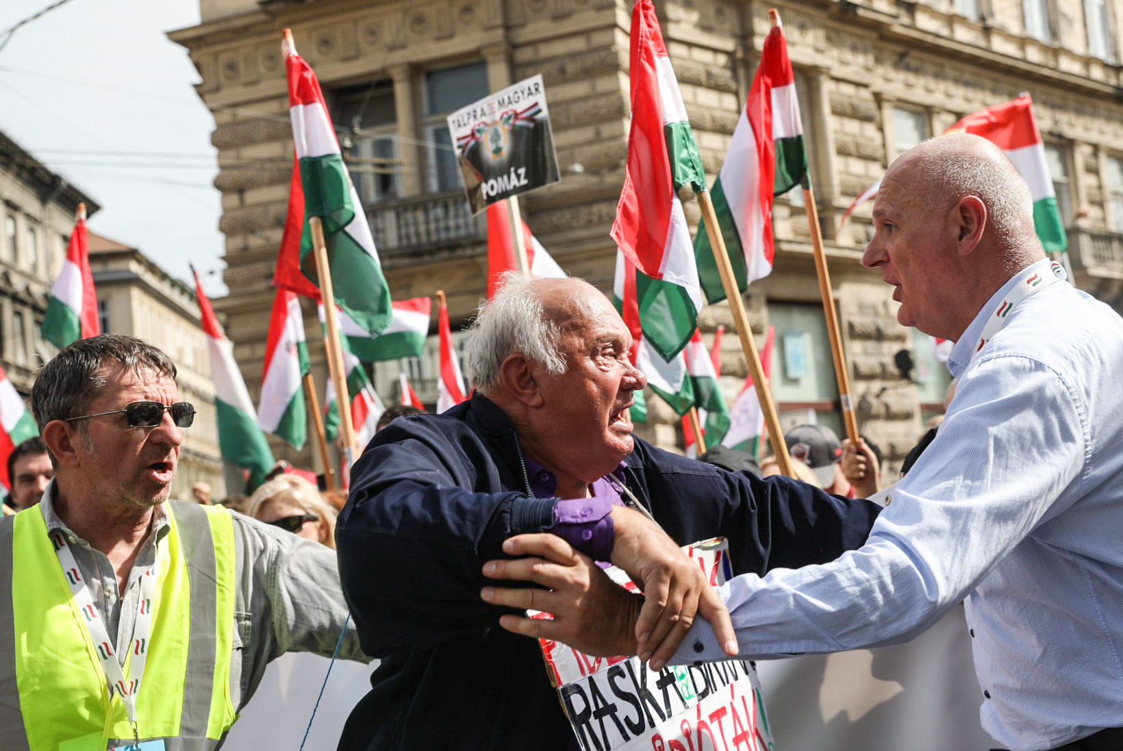A budapesti tüntetések állandó szereplőjét, Táblás Józsit megpróbálták leszerelni Magyar Péter testőrei Fotó: Bankó Gábor / 444 Fotó: Bankó Gábor / 444 De nem jártak sikerrel, jelentette helyszíni tudósítónk. Horváth Bence 2024. április 6. 14:43 Megosztás Link másolása Facebook X (Twitter) Tumblr LinkedIn