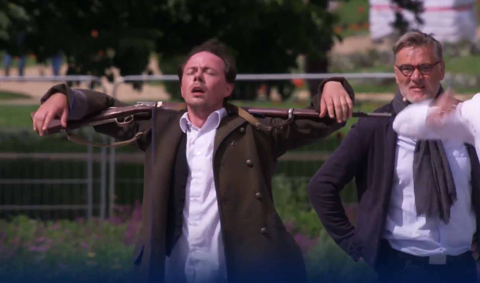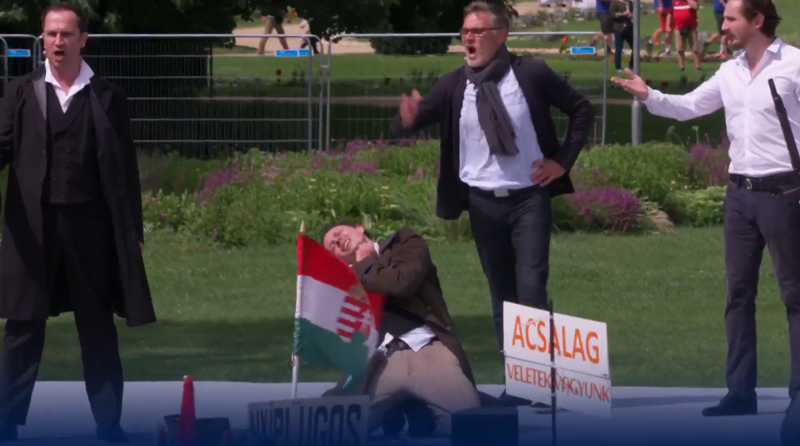 Az ünnepi műsort két vers mixével (Ady Krónikás ének 1918-ból és Babits Mihály: Zsoltár gyermekhangra) adják meg a borongós alaphangot a színpadon, szomorú zenével kísérve. Gyerekhangok sikítják, hogy béke és nem akarunk háborút, de a felnőttek mérgesen kiabálnak, egy katona pedig rosszul érzi magát. Valami teljesen új szintje politikai rendezvénynek, Orbán Viktor is élőzi, 910-en nézik ott. A kétségbeesett Elég! kiáltásra mindenki egyetértően tud csak bólogatni.
