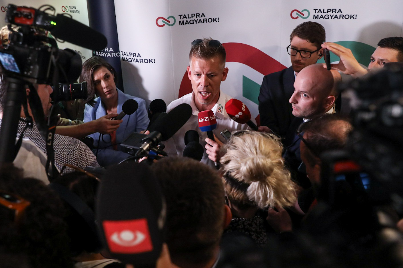 Gyülekeznek a Tisza párt szimpatizánsai, Magyar Péter újságírók előtt beszél