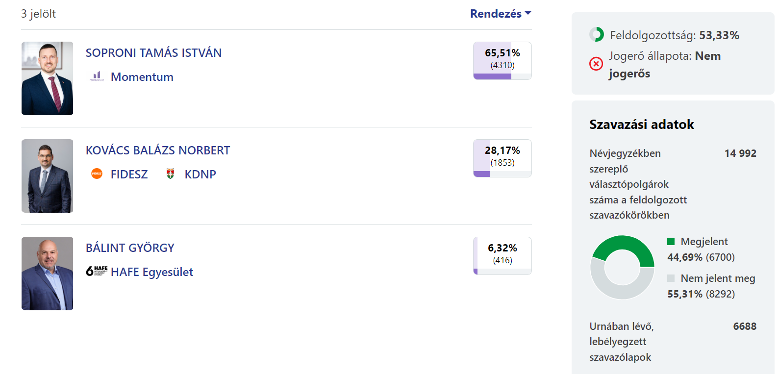 Annyira vezet a VI. kerületben Soproni Tamás, hogy a szavazatok 53 százalékának feldolgozottsága után Bedő Dávid frakcióvezető bejelentette győzelmét a Momentum eredményváróján.