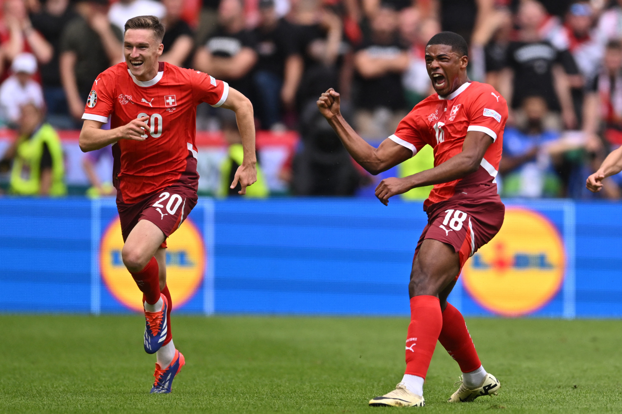 Előbb elvégzett ey szabadrúgást ígéretes helyről, hosszú előkészítés nem kapura rúgta, hanem középre adta be, kifejelték a svájciak. A szöglethez is Szoboszlai állt oda, de kisszöglet lett belőle, két méteres passzal, aztán egy átadás a vonal mellett átcsúszott a lábai között. Ezek után széttárta a karját.