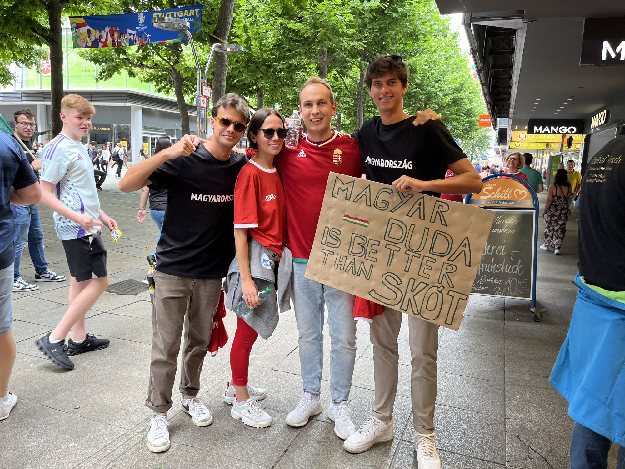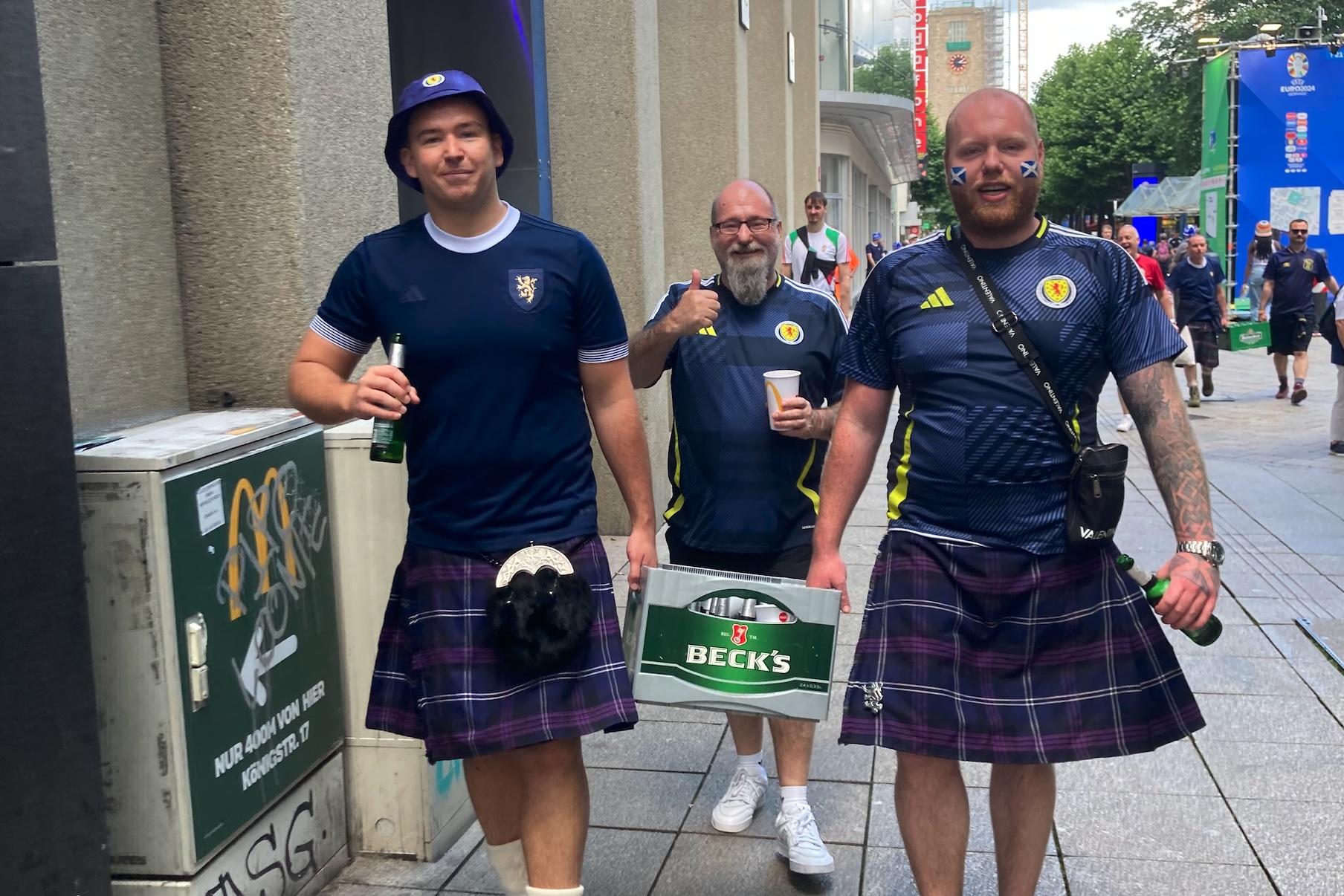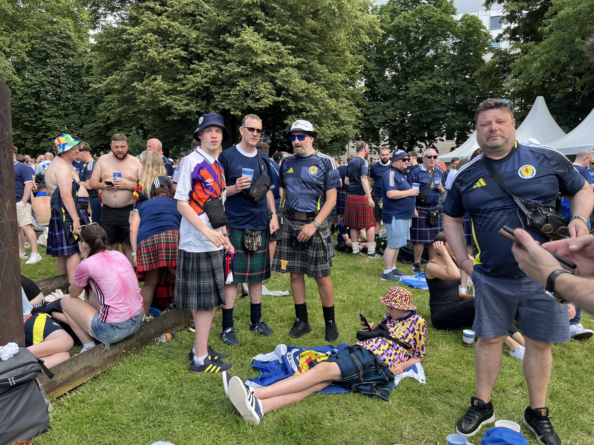 A skótok egy városi parkban gyülekeznek, olyan a helyzet, mint egy óriási pikniken, sültkolbász-szaggal, sok sörrel, de senki sem bulirontóan ittas egyelőre. Ők jórészt nem is lesznek kint a meccsen, és úgy hírlik, egy rakás német is inkább itt nézi majd a skót–magyart kivetítőn.