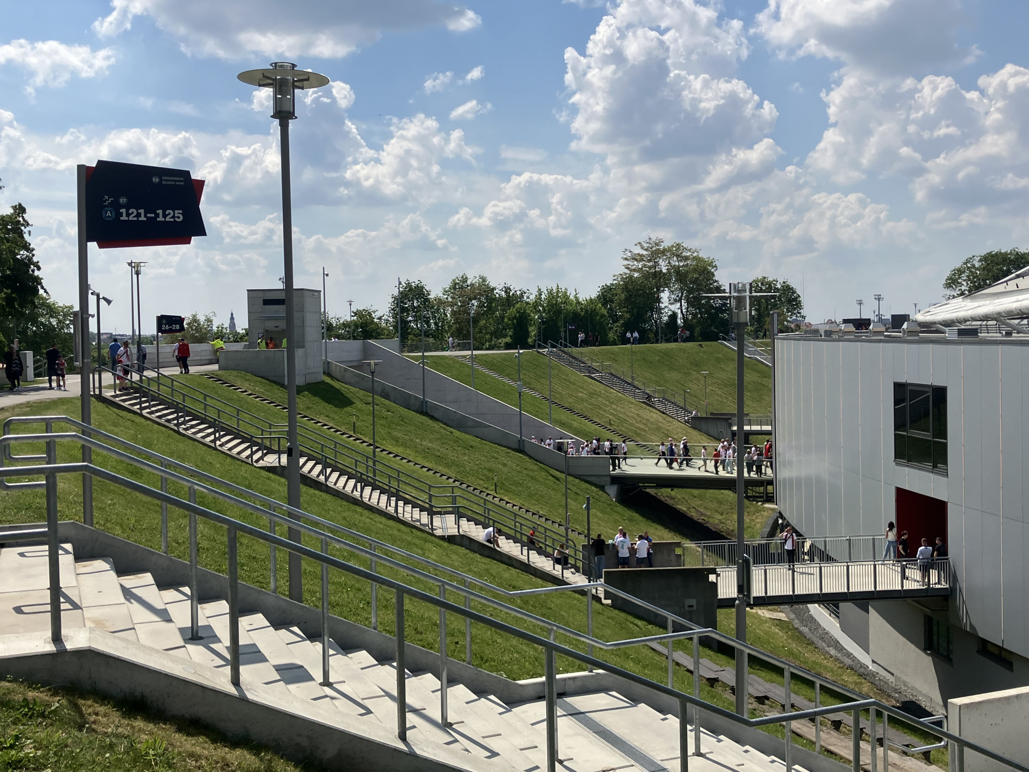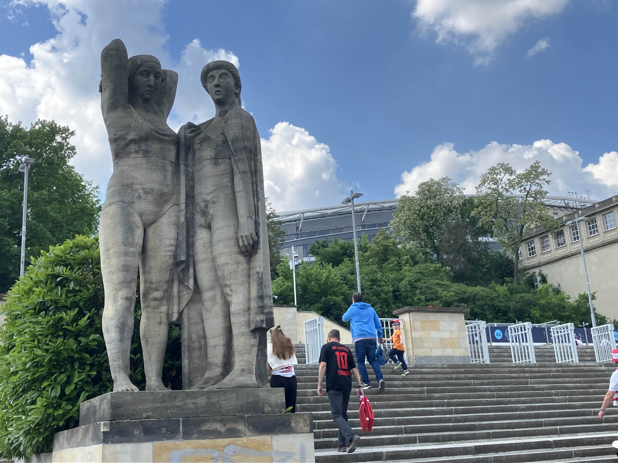 A meccset a lipcsei Red Bull Arenában játsszák, ami egy stadion a stadionban. Az ultramodern stadiont a régi, kelet-német Zentralstadion karéját felhasználva építették meg. Tavasszal jártam ott, csináltam néhány képet az NDK-s időkből megmaradt szobrokról, lelátórészről