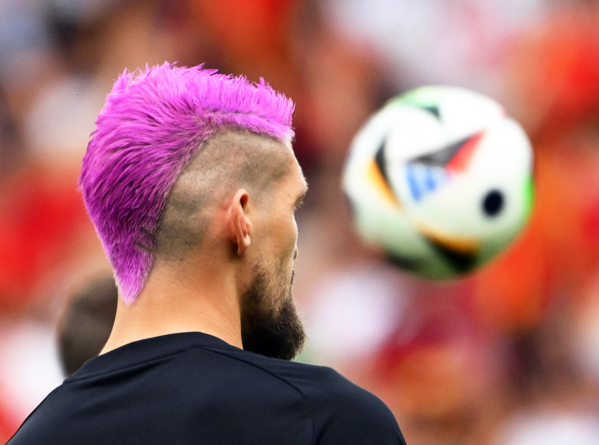 A kékhajú román után itt az Eb legújabb őrülete: a rózsaszínhajú német Kihívója akadt Andrei Rațiu-nak, a román válogatott kékhajú szárnyvédőjének. Robert Andrich a spanyolok elleni meccsre rózsaszínre festette a haját. Fotó: MARIJAN MURAT/dpa Picture-Alliance via AFP Tóth-Szenesi Péter 2024. július 5. 18:02 Megosztás Link másolása Facebook X (Twitter) Tumblr LinkedIn
