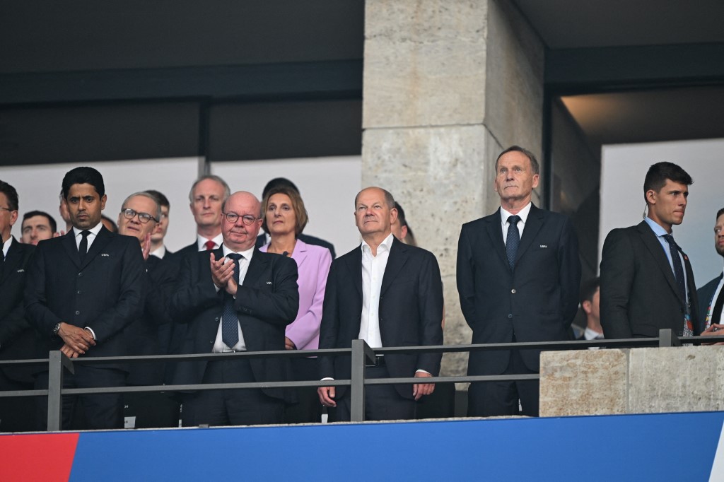 A német kancellár mellett feltűnt a PSG katari elnöke, a Mbappéval távozása előtt nagyot balhézó Nasszer Al-Khelaïfi is.