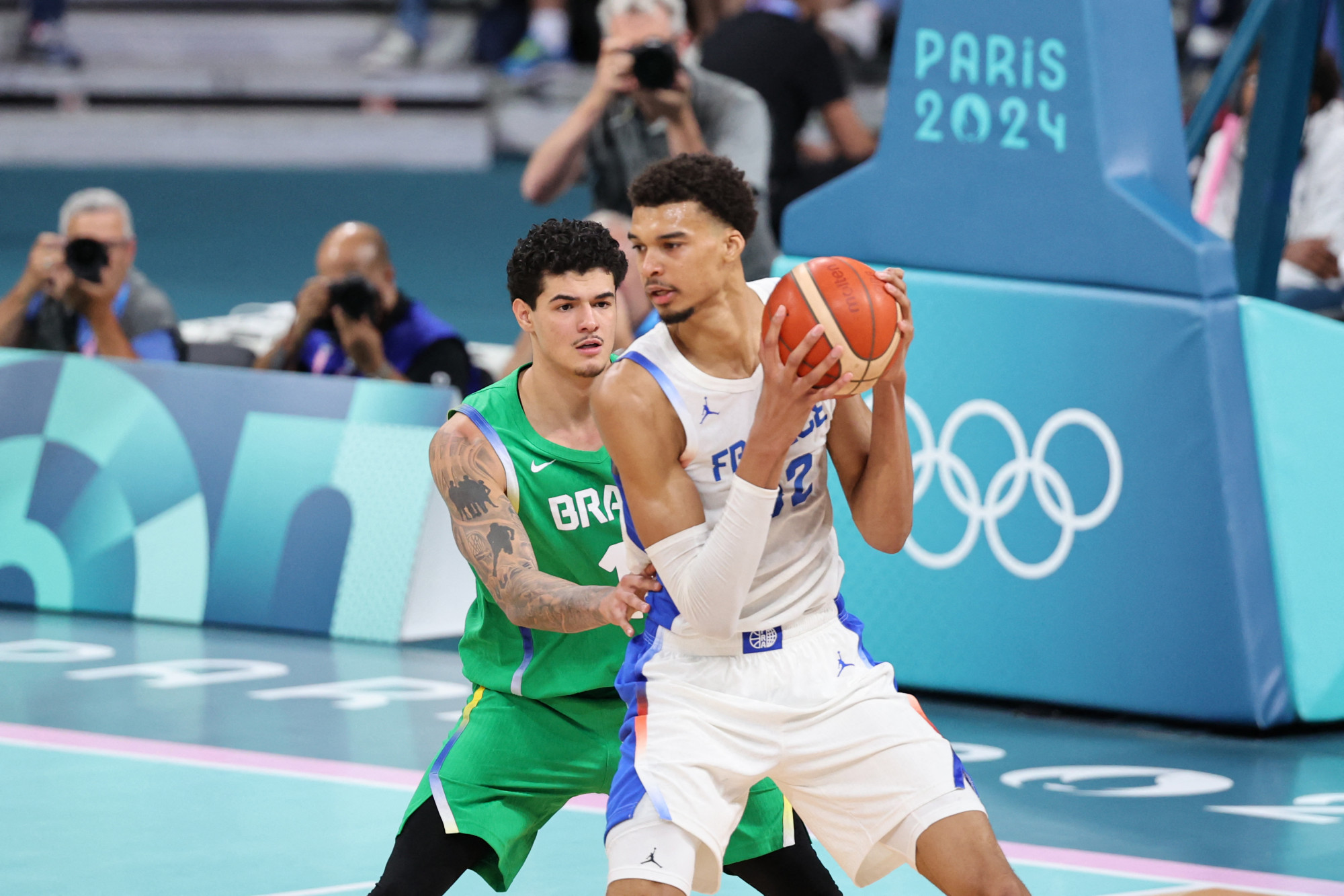 Az első félidő végére a nagy tehetség, Victor Wembanyama vezetésével azonban már átvették a vezetést a franciák, 39-36-os állással mentek szünetre a csapatok. A harmadik negyedben sem lassítottak a franciák, egyre jobban növelték az előnyüket, az utolsó játékrész előtt 12 ponttal vezettek. A negyedik negyedben közelebb jöttek a brazilok, de franciák végül 78-66-ra nyertek. Wembanyama és Batum is 19 pontot dobott.