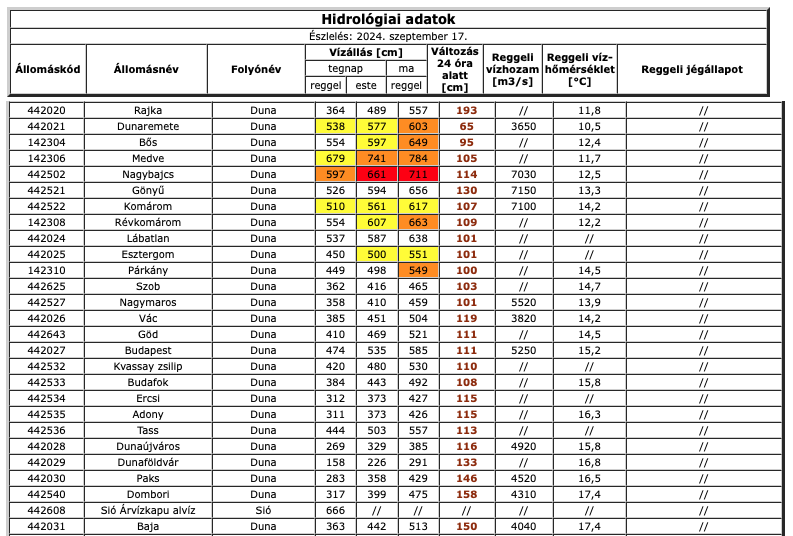 A Hydroinfo adatai szerint szinte minden magyar mérőállomásnál több mint egy métert emelkedett a Duna vízszintje 24 óra alatt, a legnagyobb változás Rajkánál volt, ott 193 centiméter a különbség tegnaphoz képest. Paksnál, Domborinál és Bajánál is jelentősen nőtt a vízszint, 146, 158 és 150 centimétert mértek.