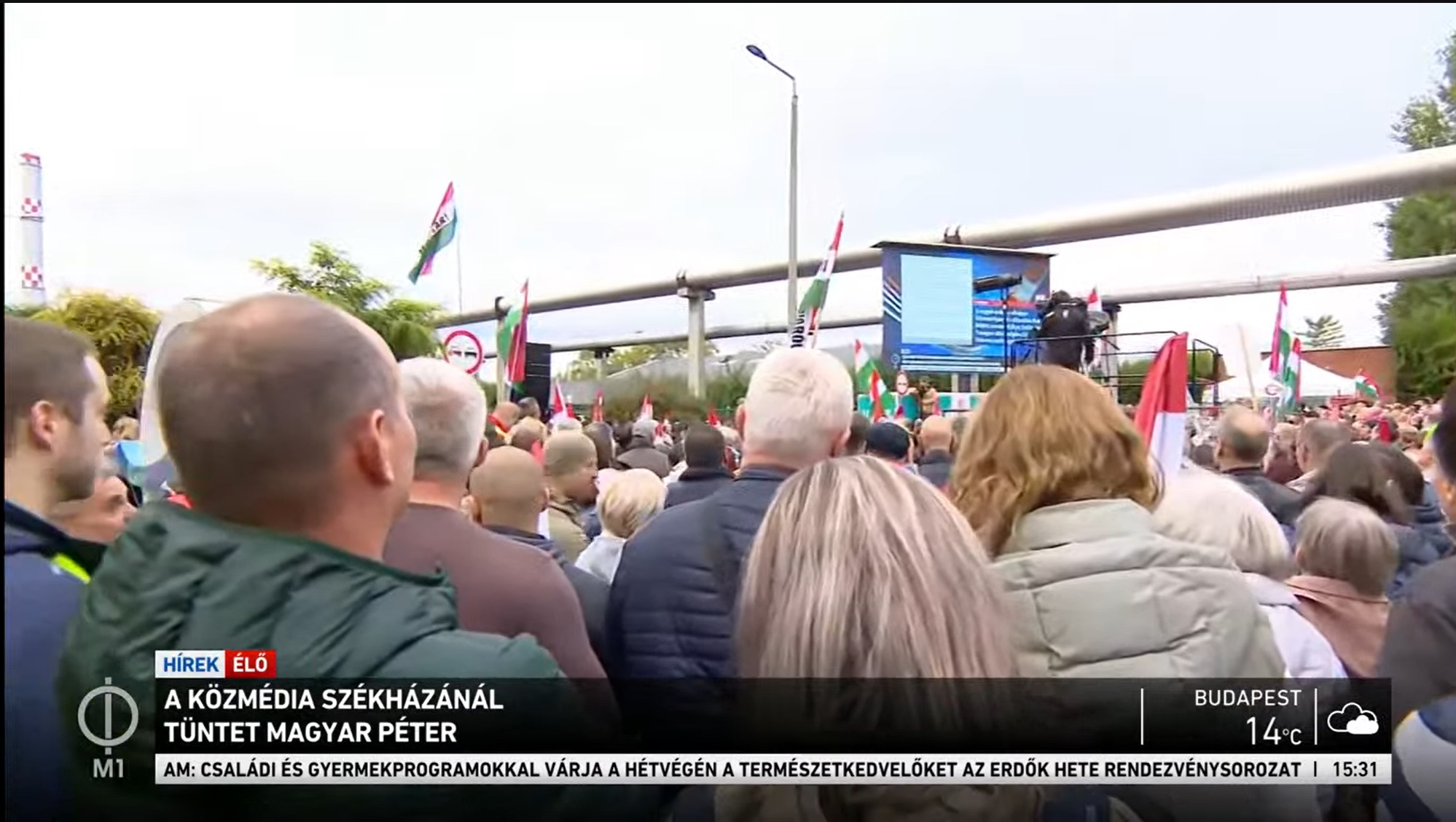 15.32-kor épp a híradó ment. Néhány másodpercre odakapcsoltak, éppen Szijjártó Pétert idézték. A műsorvezető azt ígérte, még belenéznek, közvetítik-e a tüntetést.