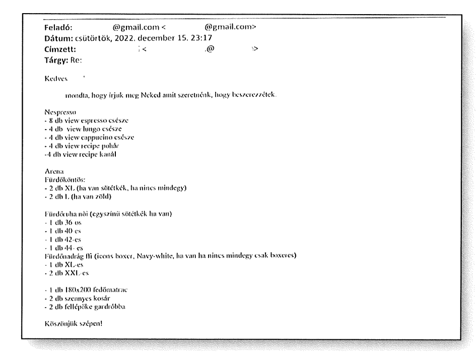 Illetve: „Ruszin-Szendi Romulsz pl. egy emailjében azt írja, hogy »szeretnénk egy whiskys hordót dizájnként a biliárdasztalhoz és egy kisebbet a dolgozószobába szervizasztalként«, a tetőteraszra párna- és köntöstárolót is kért.”