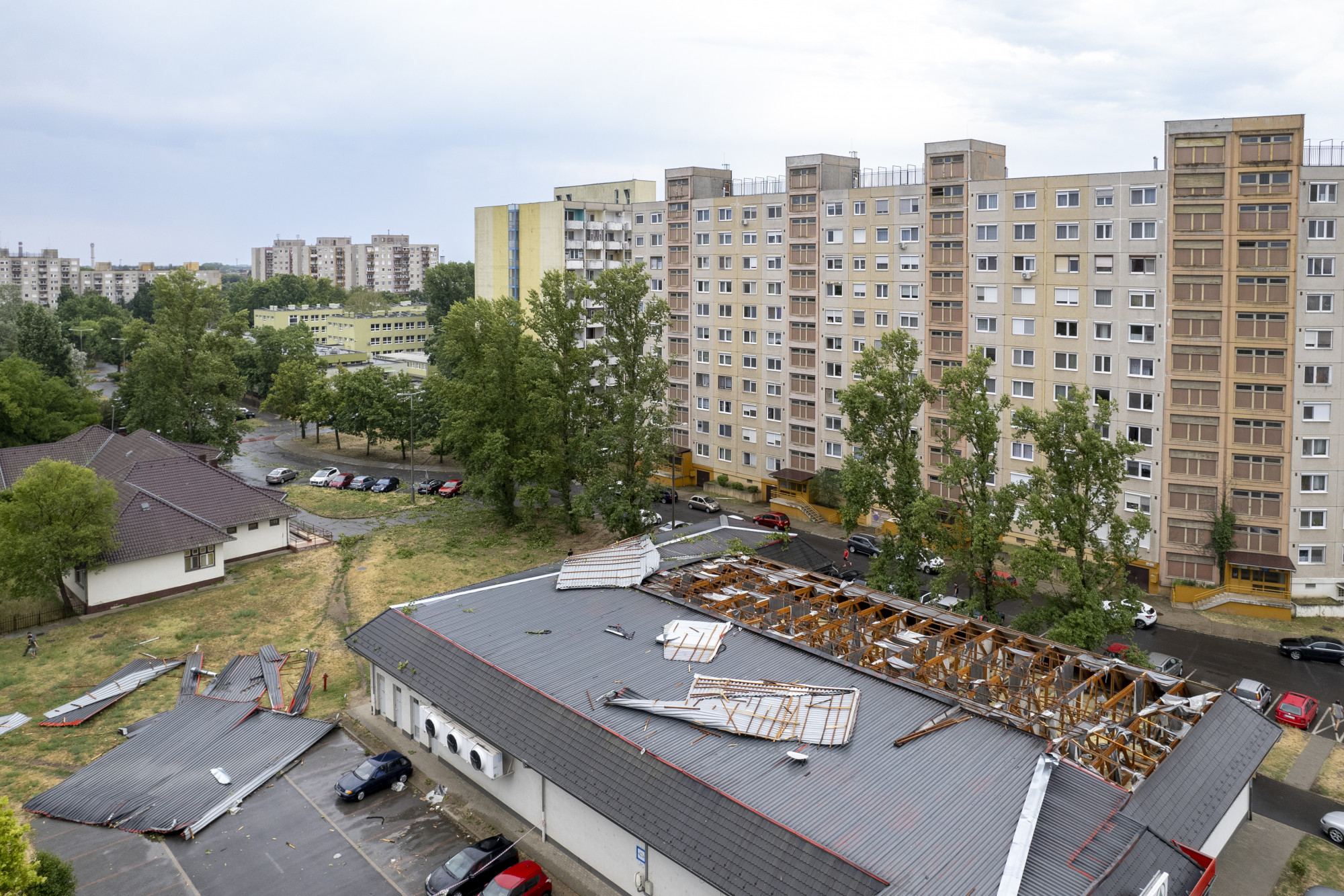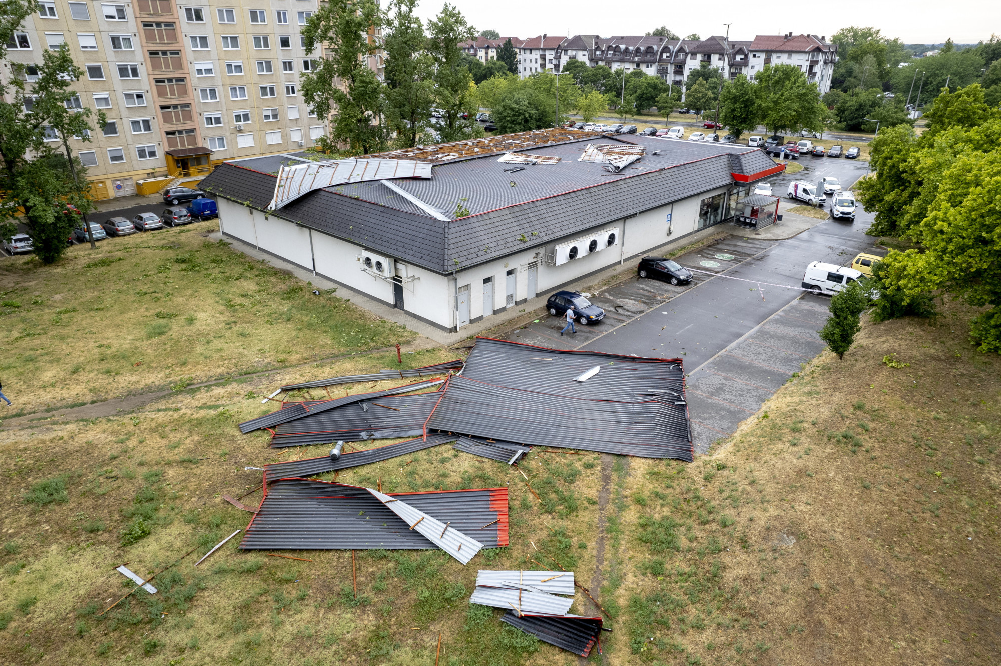 Az egyik debreceni Spar tetőszerkezete komolyan megrongálódott, miután a viharos szél feltépte a tetőt. A bevásárlóközpontról készített drónfelvételeken azt is lehet látni, hogy a leszakadt elemeket a parkolóra és az épület melletti füves területre fújta a szél.