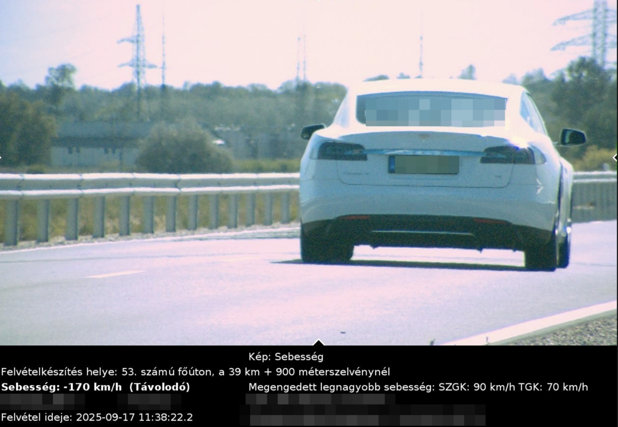 Ugyanazon a főúton, ugyanott kaptak el egy életveszélyes tempóval hasító elektromos autóst, egy 170-nel döngető teslást, mindössze 210 ezer forint fejében.