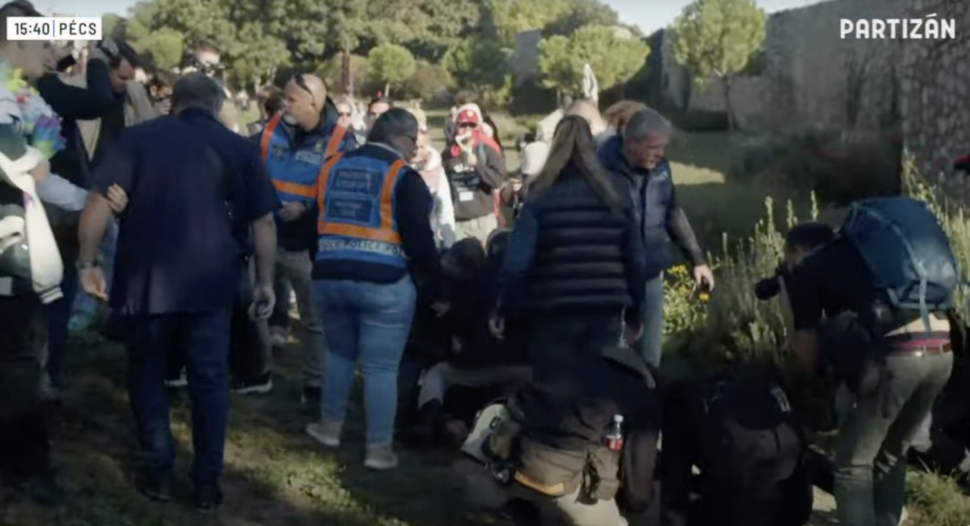 A megvadult férfi, aki a hírek szerint elbánt egy zászlóval is, és egy molinót is ütögetett, megcsúszott az út szélén. A rendőrök gyorsan elkapták és bilincsben egy nagy bokor mögé vitték. (A képek a Partizán élő adásából vannak.)
