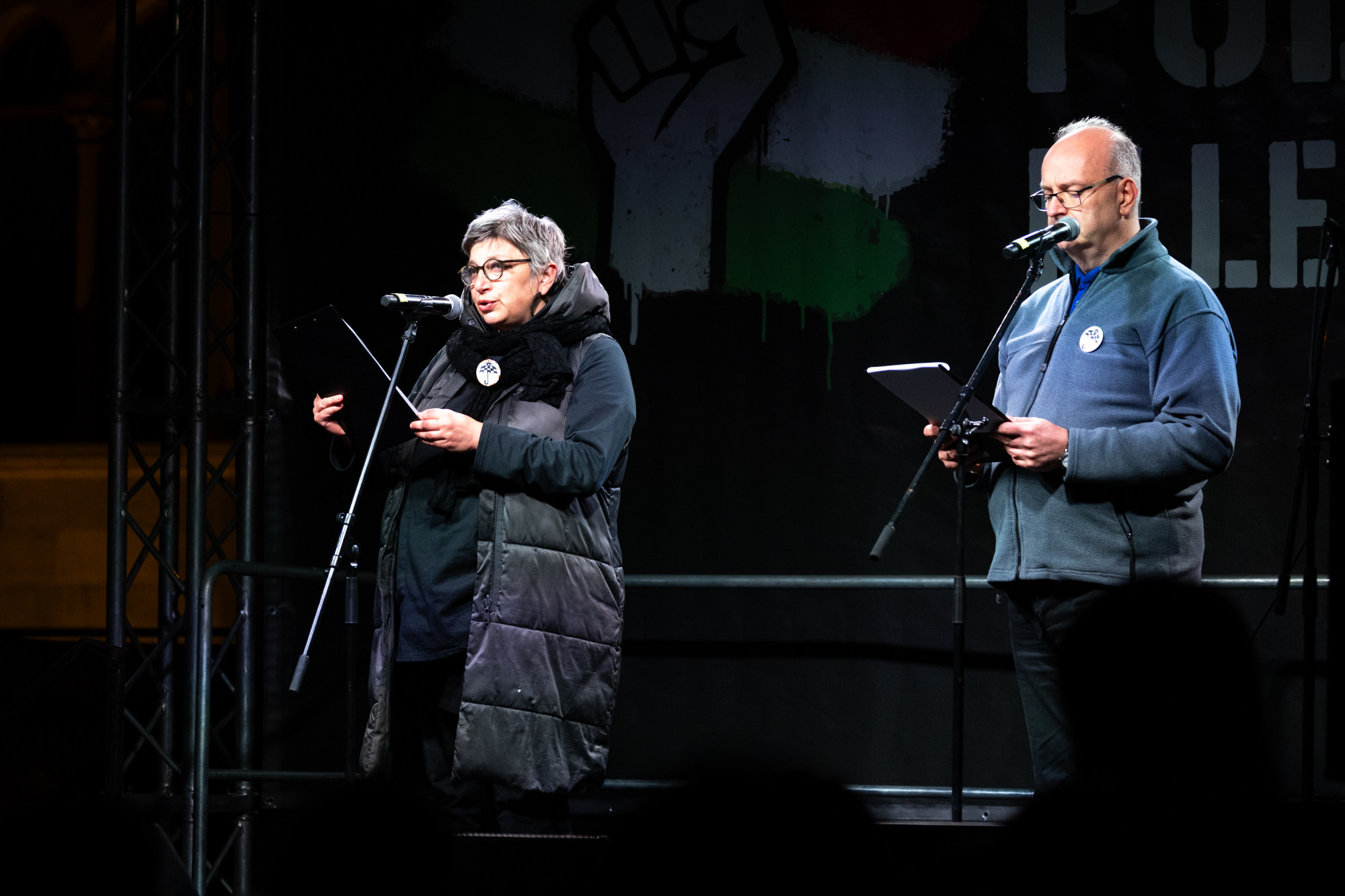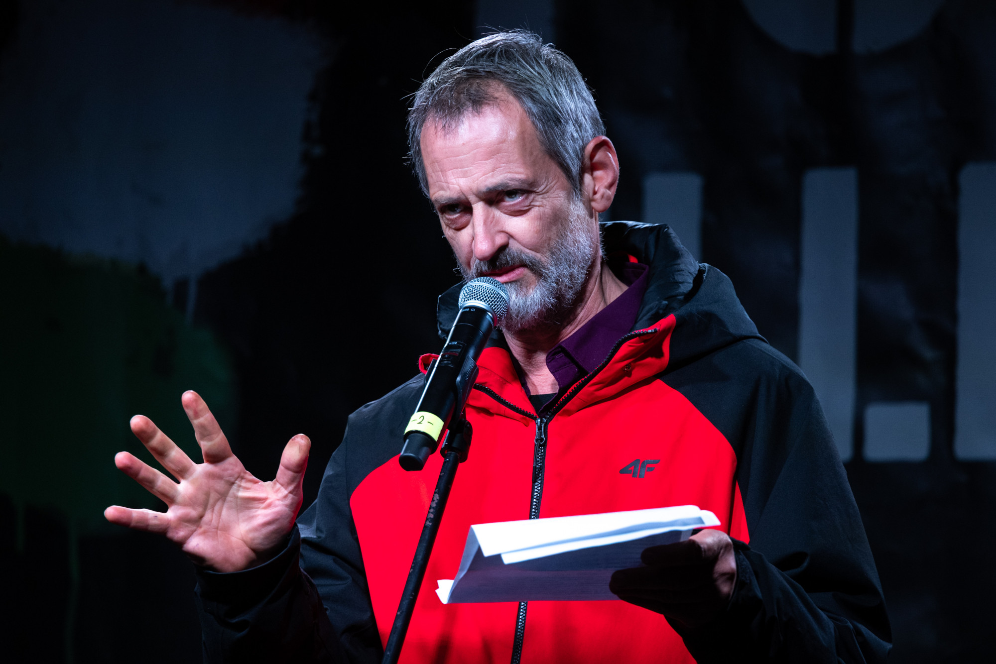 Törley Katalin és Pilz Olivér a színpadon, egyikük azt mondja, ő Juhász Péter, a másikuk is, csak franciául. A Tanítanék Mozgalom két alapítója szolidarítani érkezett azokkal, akiket megfélemlített a bántalmazó hatalom. Megszólalásaikat Arany János Walesi bárdok című balladájának soraival kezdik.