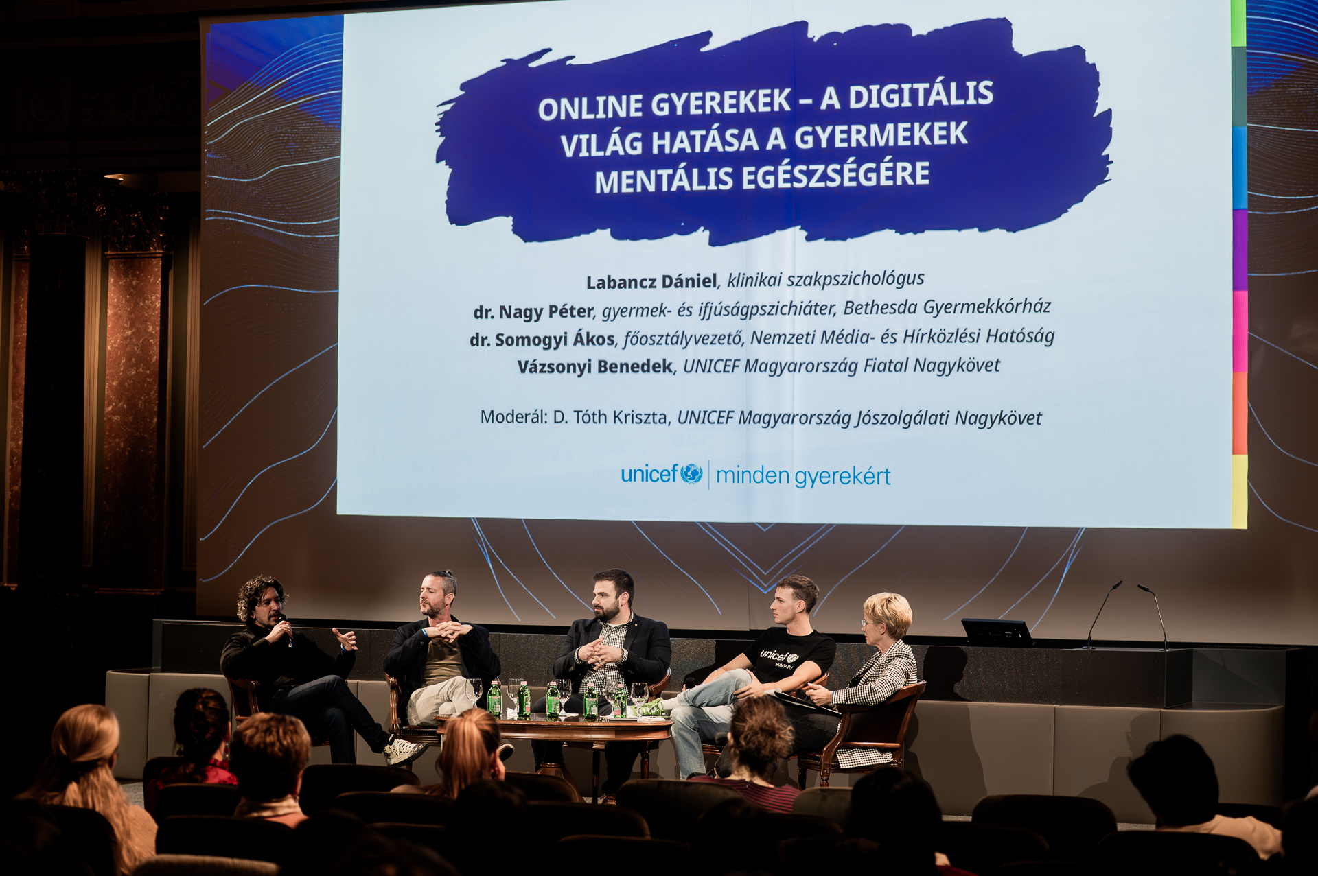 A konferencia fókuszába került az iskolai bullying is, de ennél is nagyobb hangsúlyt kapott a digitális világ és annak a gyerekek és fiatalok mentális egészségére gyakorolt hatása. Az, hogy a fiatalokat mennyi minden leterheli digitális téren, akkor vált a igazán nyilvánvalóvá, amikor Vázsonyi Benedek, az UNICEF Magyarország Fiatal Nagykövete, aki tavaly kezdte az egyetemet, hadarva, hosszan sorolta, hogy mi mindent kell egy nap az online térben csinálnia:
