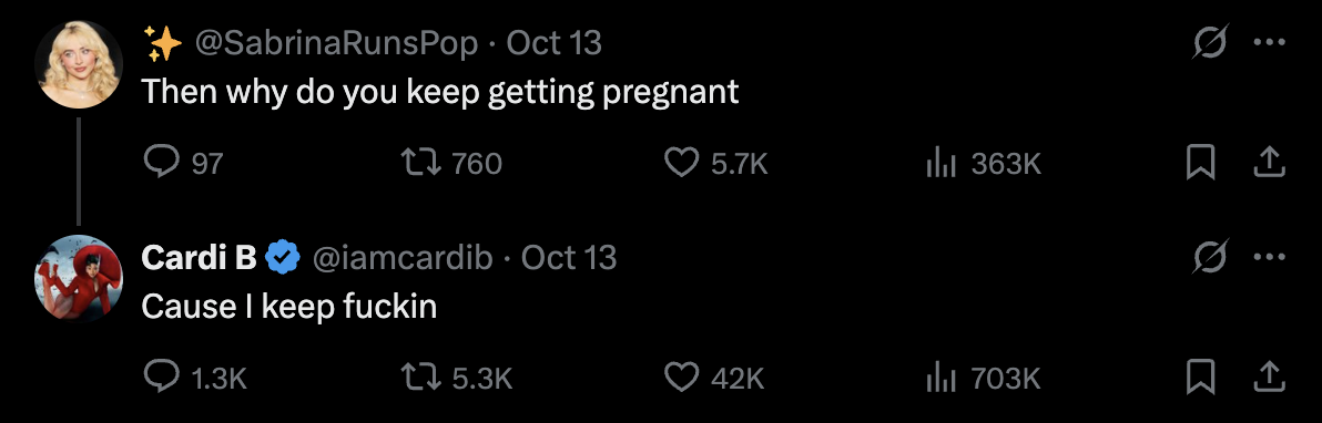 Ezen felbuzdulva valaki azonnal megkérdezte tőle, hogy akkor miért lesz folyton terhes, mire Cardi B egy váratlan válasszal állt elő: