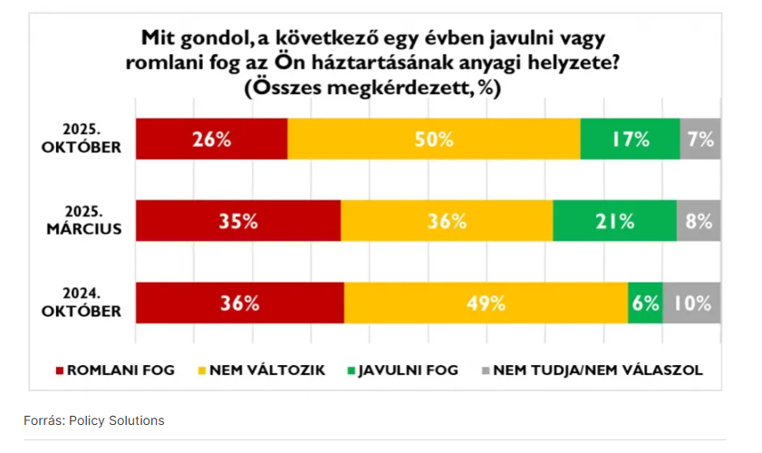 Az emberek fele arra számít, hogy nem javul majd a háztartásuk anyagi helyzete a következő egy évben – derült ki a Policy Solutions friss elemzéséből, amit a Telexen publikáltak. 26 százalék romlásra, 17 százalék javulásra számít.