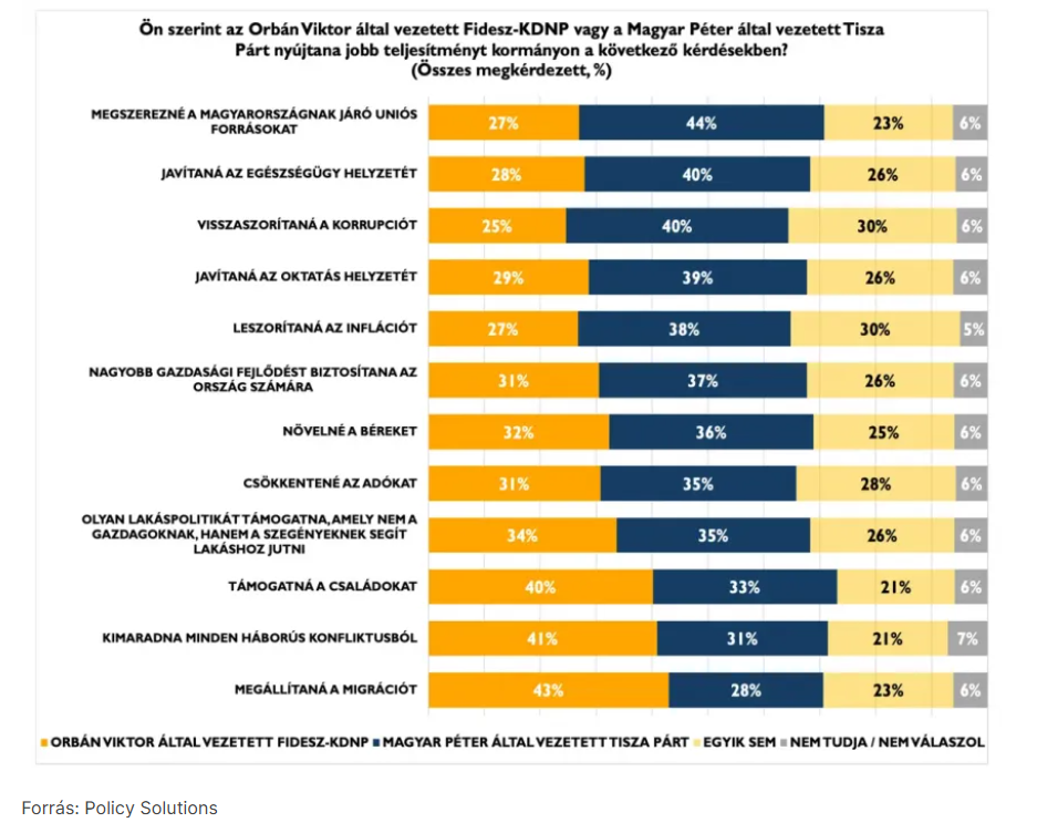 A kutatás során megkérdezték azt is, a Fidesz vagy a Tisza kormányozna-e jobban 12 felsorolt területen. A válaszok alapján a migrációt, a háború elkerülését és a családtámogatásokat leszámítva a többi területen a Tiszától várnak jobb teljesítményt az emberek. A lakáspolitikát nézve hajszálnyi a különbség, az viszont érdekes, hogy nem ment át a propaganda üzenete arról, hogy a Tisza valójában emelné az adókat. (Ezt Magyar Péter visszautasítja.)