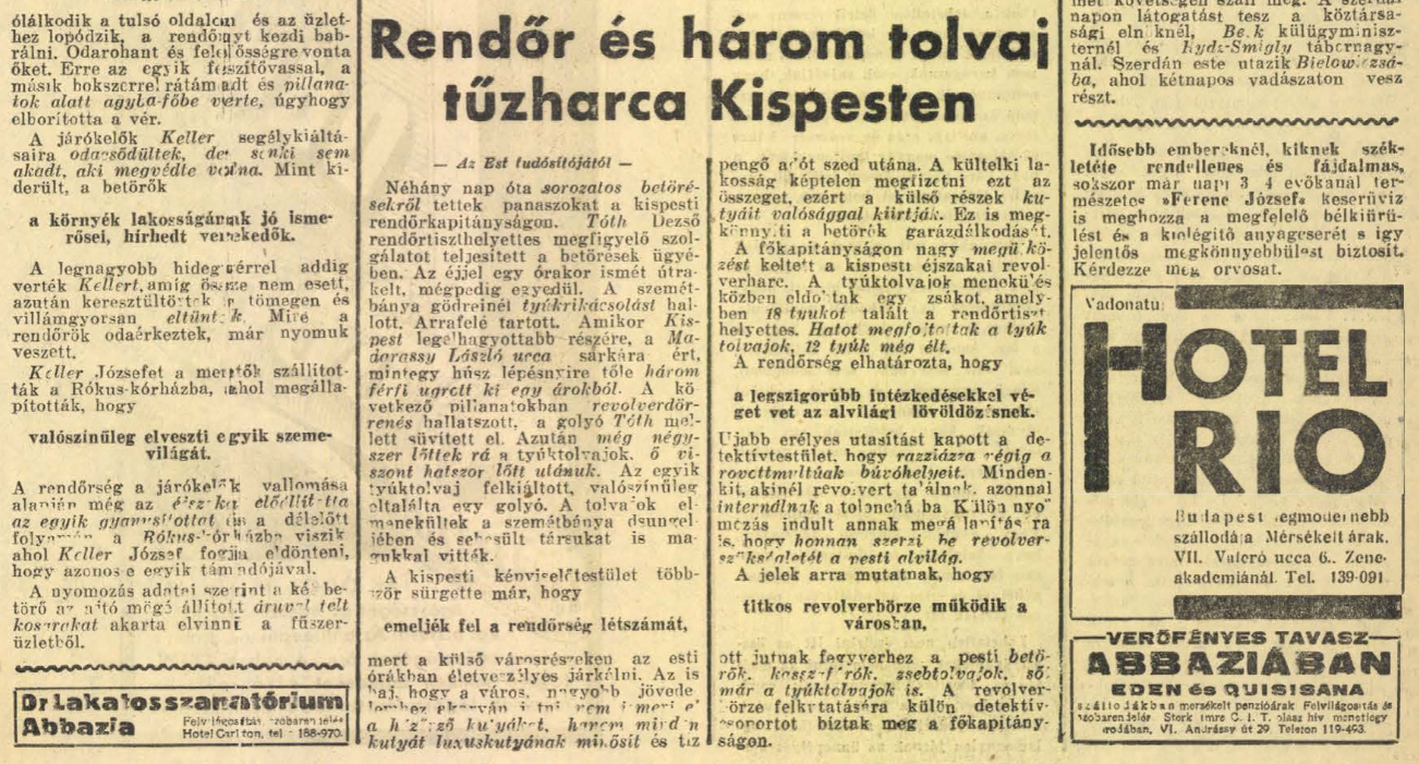 Tóth Dezső rendőrtiszthelyettest megfigyelőszolgálatra rendelték ki 1938 februárjában, miután sorozatos betörésekről érkeztek hírek a kispesti rendőrkapitányságra. „A szemétbánya gödreinél tyúkrikácsolást hallott – írta Az Est. – Arrafelé tartott. Amikor Kispest legelhagyatottabb részére, a Madarassy László utca sarkára ért, mintegy húsz lépésnyire tőle három férfi ugrott ki egy árokból. A következő pillanatokban revolverdörrenés hallatszott, a golyó Tóth mellett süvített el. Azután még négyszer lőttek rá a tyúktolvajok, ő viszont hatszor lőtt utánuk.” A jelek arra utaltak, hogy az alvilág titkos revolverbörzét működtet, mert már a tyúktolvajok is felfegyverkezve járnak. A revolverbörze felkutatására külön detektívcsoportot bíztak meg a főkapitányságon.