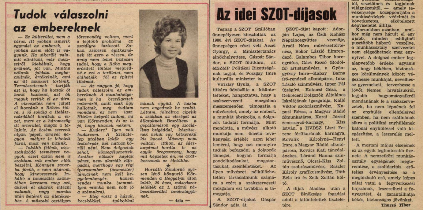 Horváth Sándorné gyesen lévő körmendi könyvelőt az egyes számú választókerület tanácstagjává jelölték 1980 tavaszán. Ennek ellenére inkább félénk, visszahúzódó természetű volt, aki nem igazán szokott sok ember előtt beszélni. Könnyen zavarba jött, nem akarta, hogy kinevessék. Valamit mégis jól csinálhatott, mert már másodszorra jelölték tanácstagnak. „Ha sikerült valamit elintézni, már messziről kiabáltak, hogy örülnek, jól van – mondta az őt felkereső Vas Népe újságírójának. – Mintha nálunk jobban megbecsülnék, értékelnék, ami az itt lakókért történik. Természetesnek tartják azt is, hogy ha hoztak öt kocsi kavicsot, azt ők maguk terítik el az útra.” Kudarc is érte már. Egy hatvan körüli, rendkívül rossz körülmények között a Szénatelep utcában lakó közsegélyezett testvérpár körülményein akart javítani, de nem kapott tőlük köszönetet, sőt: őt magát hordták le, mit képzel, minek avatkozik az életükbe?
