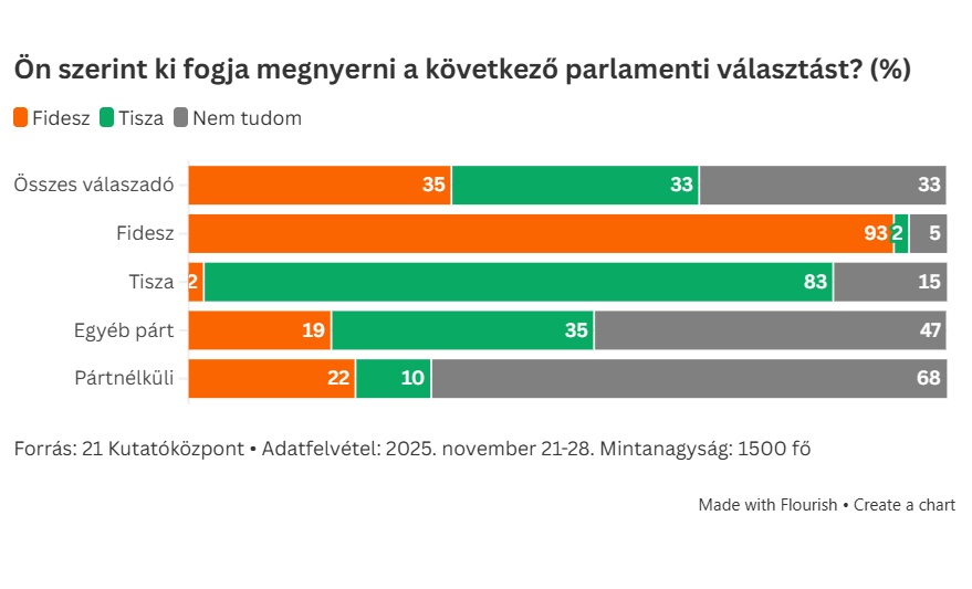 A közvélemény nagyjából fele-fele arányban látja esélyesebbnek a jövő évi választásokon a Fideszt és a Tisza Pártot: 35 százalék szerint a Fidesz, 33 százalék szerint a Tisza fog nyerni 2026 áprilisában a 21 Kutatóközpont frissen publikált felmérése szerint. Ez lényegében ugyanaz az arány, mint egy hónappal korábban, októberben, vagyis a várakozások alig mozdultak el.