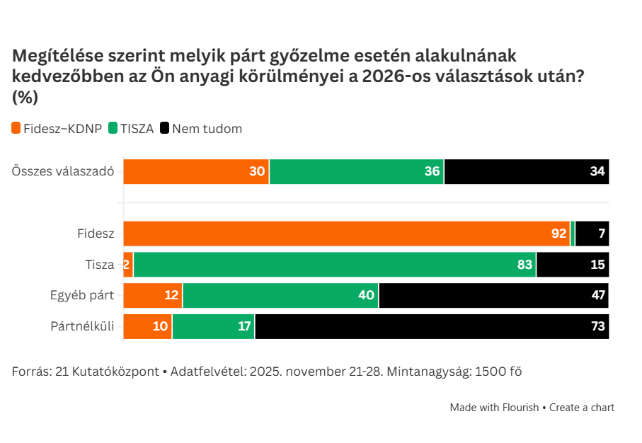 A Róna Dániel vezette kutatóintézet közösségi finanszírozást használ fel a kutatásaihoz, és a támogatóik is javasolhattak kérdéseket. Így került be a kérdéssorba az is, hogy mit gondolnak a szavazók, ők személy szerint anyagilag melyik oldal győzelmével járnának jobban. Itt többen várták azt, hogy a Tisza győzelme esetén jobban alakulnának a személyes anyagi körülményeik: 36 százalék vélekedik így, míg 30 százalék egy újabb Fidesz-kormányzástól remél személyesen is többet.