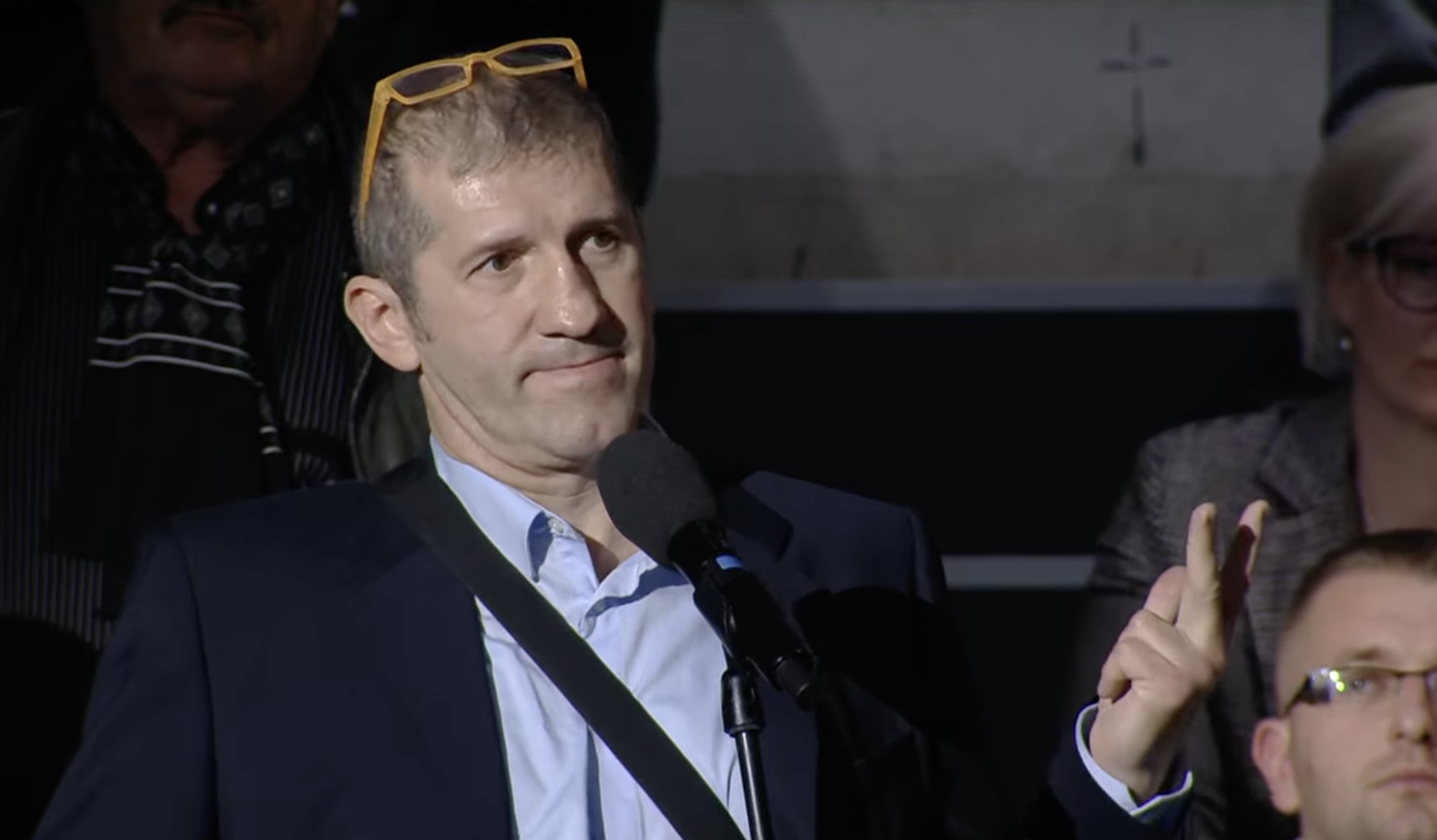 Az első 5-6 kérdés le is ment simán, majd mikrofonhoz lépett egy férfi, és azt mondta, „Orbánhoz és Tuzsonhoz lenne kérdésem” (a kormány több tagja, így Tuzson Bence igazságügyi miniszter is ott volt a gyűlésen). Tegeződve folytatta: „miért hazudtatok a gyerekekről – az igazságügyi miniszter jelentésére gondolok- , miért nem védtétek meg a gyerekeket?”