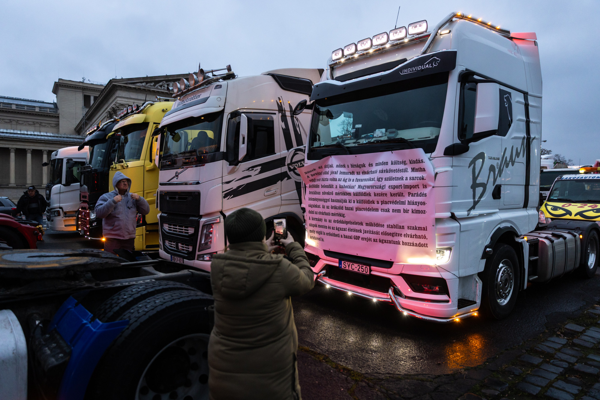 A lap szerint az egyik fő szervező, Orosz Tibor azt mondta az eseményen, hogy a többi kamion bejuttatásán folyamatosan dolgoznak, mert az esemény több felszólalója is kívül rekedt, a terv szerint a Hősök terén 20 óráig lesznek ott a kamionosok, majd elmennek az M3-as bevezetőhöz.