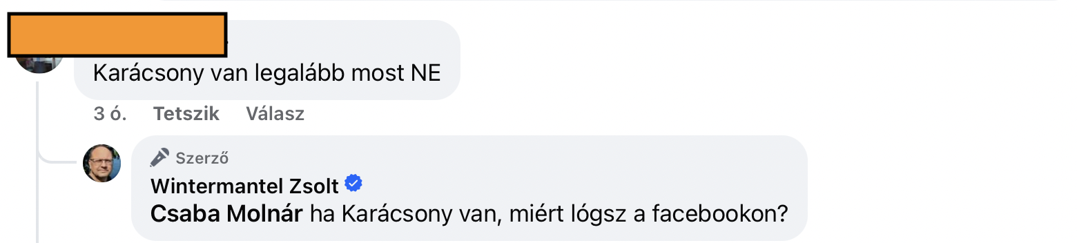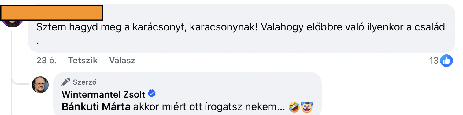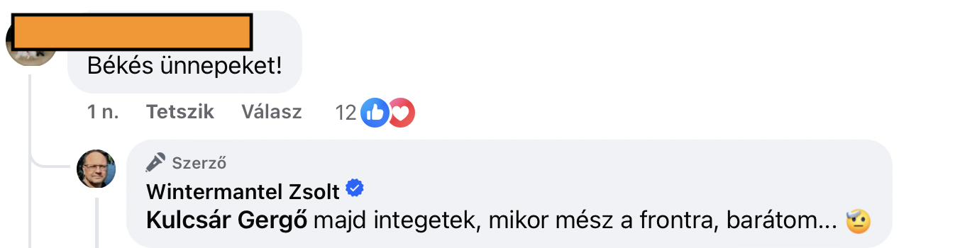 A legintenzívebb harcot az újpesti Wintermantel Zsolt folytatta 24-én és 25-én is, legalábbis kora délutánig tuti, hogy ő a legaktívabb. 24-én reggel posztolt egyet azzal a bíróság által letiltott Bors különszámmal, amely a Fidesz szerint valódi, a Tisza szerint kamu, mesterséges intelligenciával készült irathalomról állítja, hogy ez Magyarék adóprogramja. A röhögő nagy fölénnyel legyőzték a like-okat, a kommentek alapján sem mindenki fogadta kitörő örömmel a posztot. Wintermantel aztán az ünnepi asztalt otthagyva 24-én este ki is válogatta ezekből a legerősebbeket, majd 25-én délelőtt lelkileg megerősödve tért vissza a háborúba. Ezzel az érvével például nehéz vitatkozni, matt az 5 D-s sakkjátszmában.