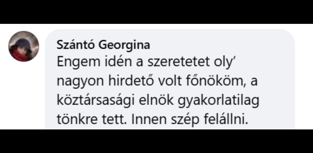 Szántó Georgina azt írta, mindennek szellemében érdemes meghallgatni a karácsonyi beszédet. Régóta le akarta mindezt írni, állítja a kommentekben, de félt, „mert a rendszer lejárat mindenkit, aki meg mer szólalni. De már nem érdekel. Állok elébe bárminek.” Később azt is írta, hogy nyilván lesz ebből baja. „Sok-sok hazugság, mindenféle kitalált dolgok. Nem érdekel. Nekem ez már annyira nyomta a lelkem, hogy ha tovább viszem magammal, akkor agyonnyom.”