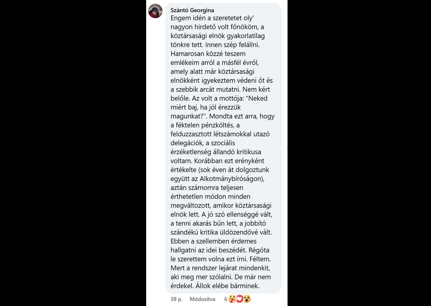 „A jó szó ellenséggé vált, a tenni akarás bűn lett, a jobbító szándékú kritika üldözendővé vált” – írta Sulyok Tamásról kommentben Szántó Georgina, a köztársasági elnök volt kommunikációs igazgatója pénteken, nem sokkal azután, hogy közzétették az államfő karácsonyi beszédét. „Engem idén a szeretetet oly nagyon hirdető volt főnököm, a köztársasági elnök gyakorlatilag tönkre tett. Innen szép felállni” – indította a posztot Szántó.