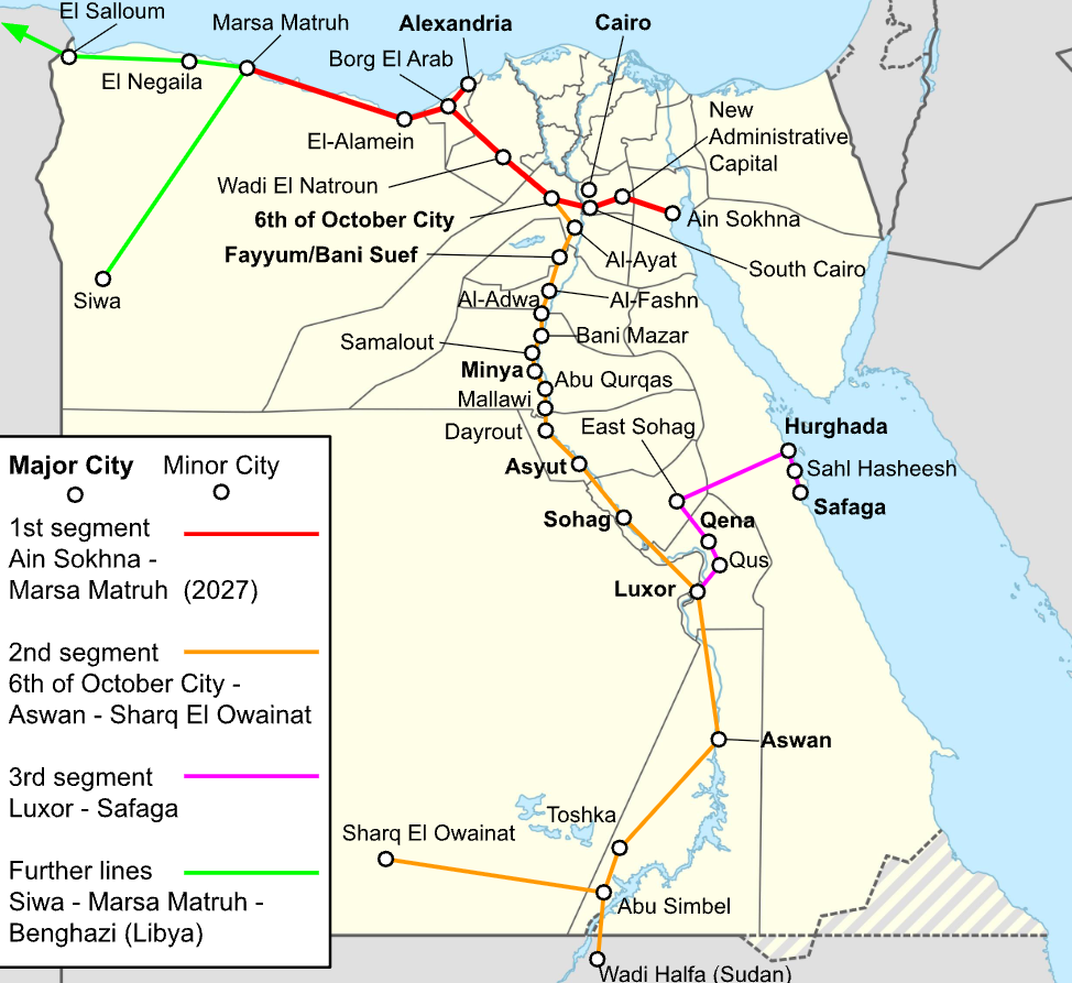 A terv, hogy a Green Line 2027-re vagy 2028-ra elkészüljön. Ezt további két vonal követné: a Kék vonal a Nílus mentén Kairó és Asszuán között, valamint a Vörös vonal, amely Hurghadát és Safagát kötné össze Luxorral.